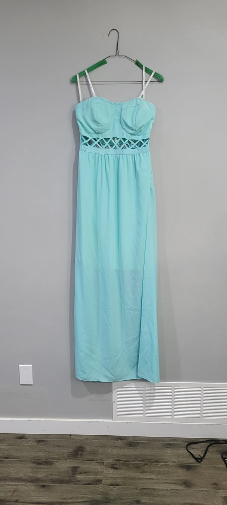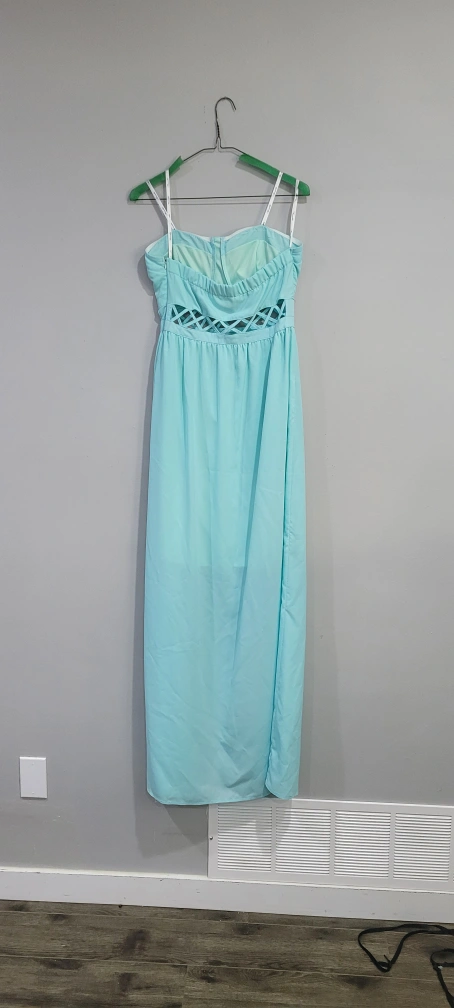 Light blue strapless maxi dress by Marineblu. It features a criss-cross cutout detail at the waist. Size medium. Stored clean and in protective plastic.
