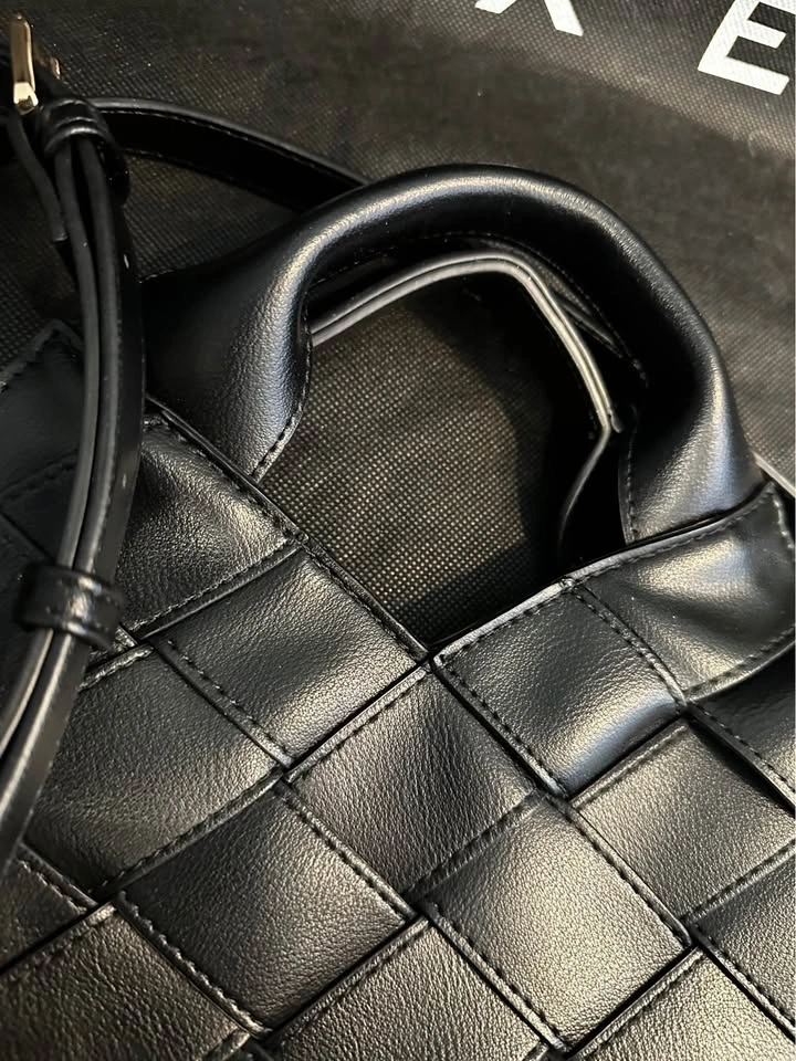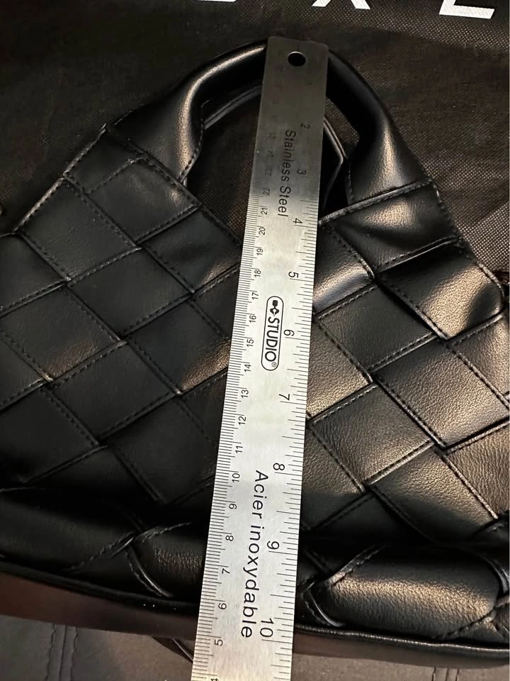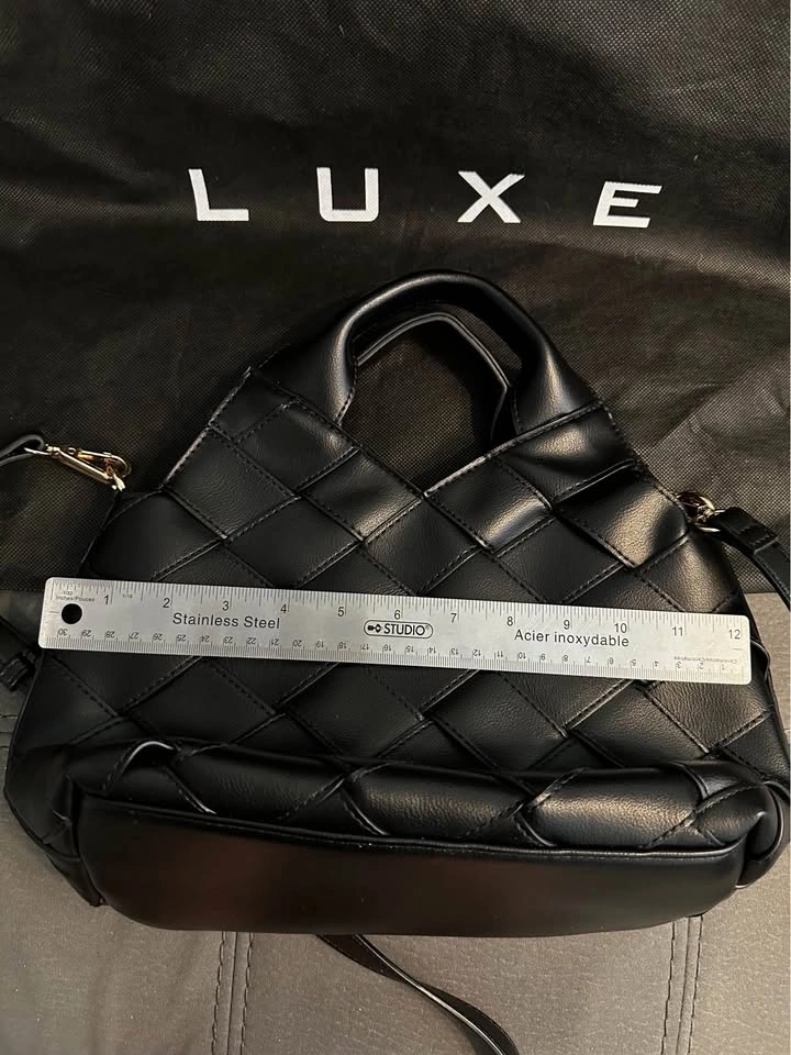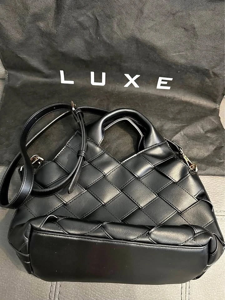 Stylish black woven handbag. Bag has top handles and a detachable, adjustable shoulder strap. Comes with original LUXE dust bag. Bag measures about 11 inches wide. Great for everyday or going out. Brand NEW! Pickup only in Coquitlam, Westwood Plateau (behind IGA).