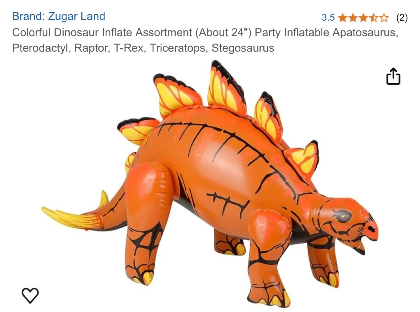 Orange inflatable dinosaur. Approximately 24 inches. Party decoration. Includes other dinosaur styles. Similar to this