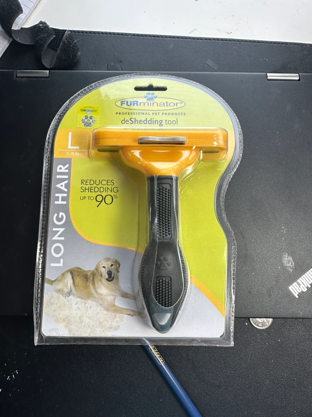 This FURminator deShedding Tool is designed for long-haired pets weighing 51-90 lbs. It effectively reduces shedding by up to 90%. This tool is designed for long hair pets.