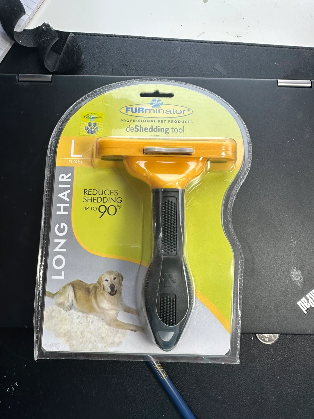 This FURminator deShedding Tool is designed for long-haired pets weighing 51-90 lbs. It effectively reduces shedding by up to 90%. This tool is designed for long hair pets.