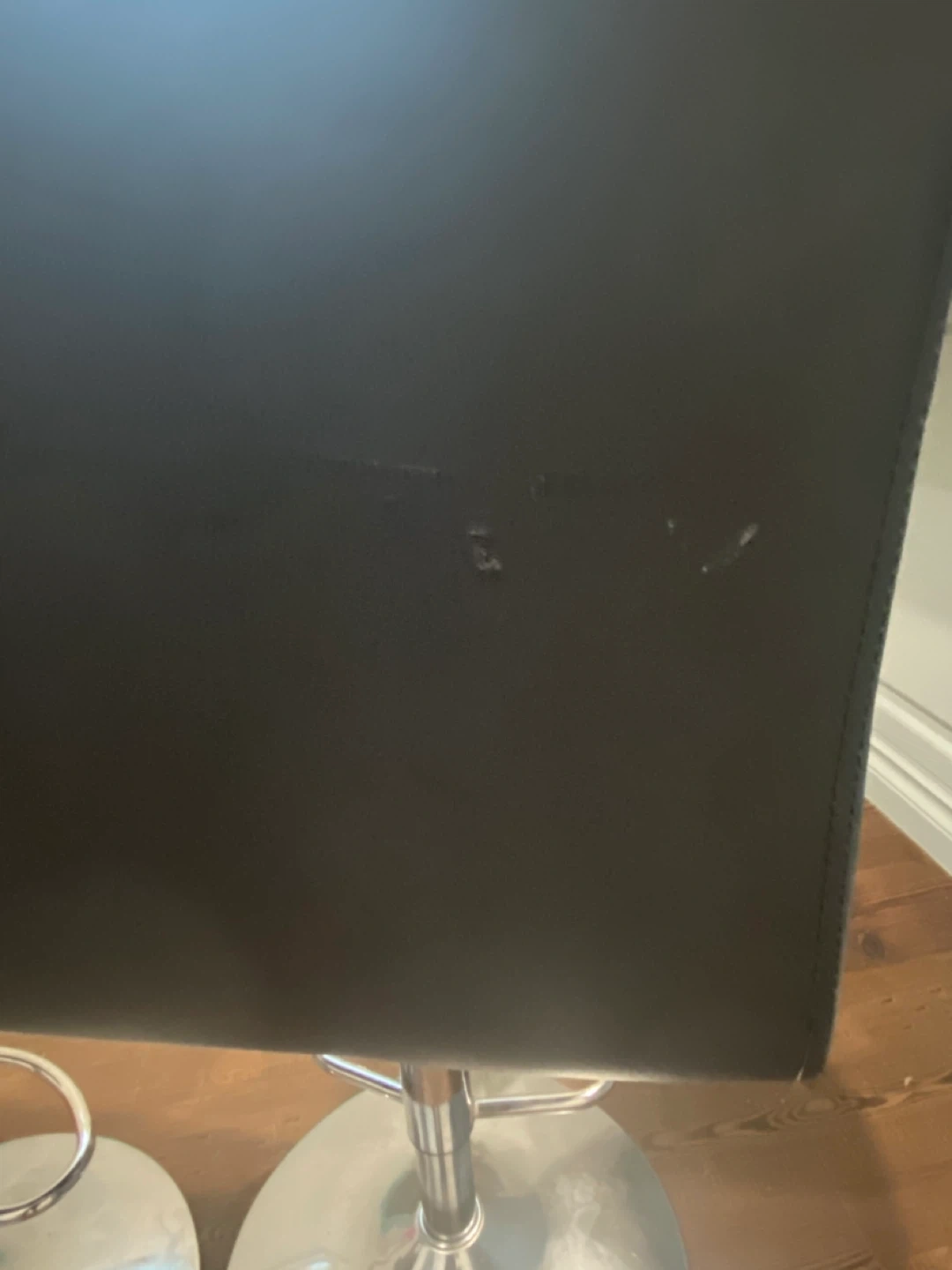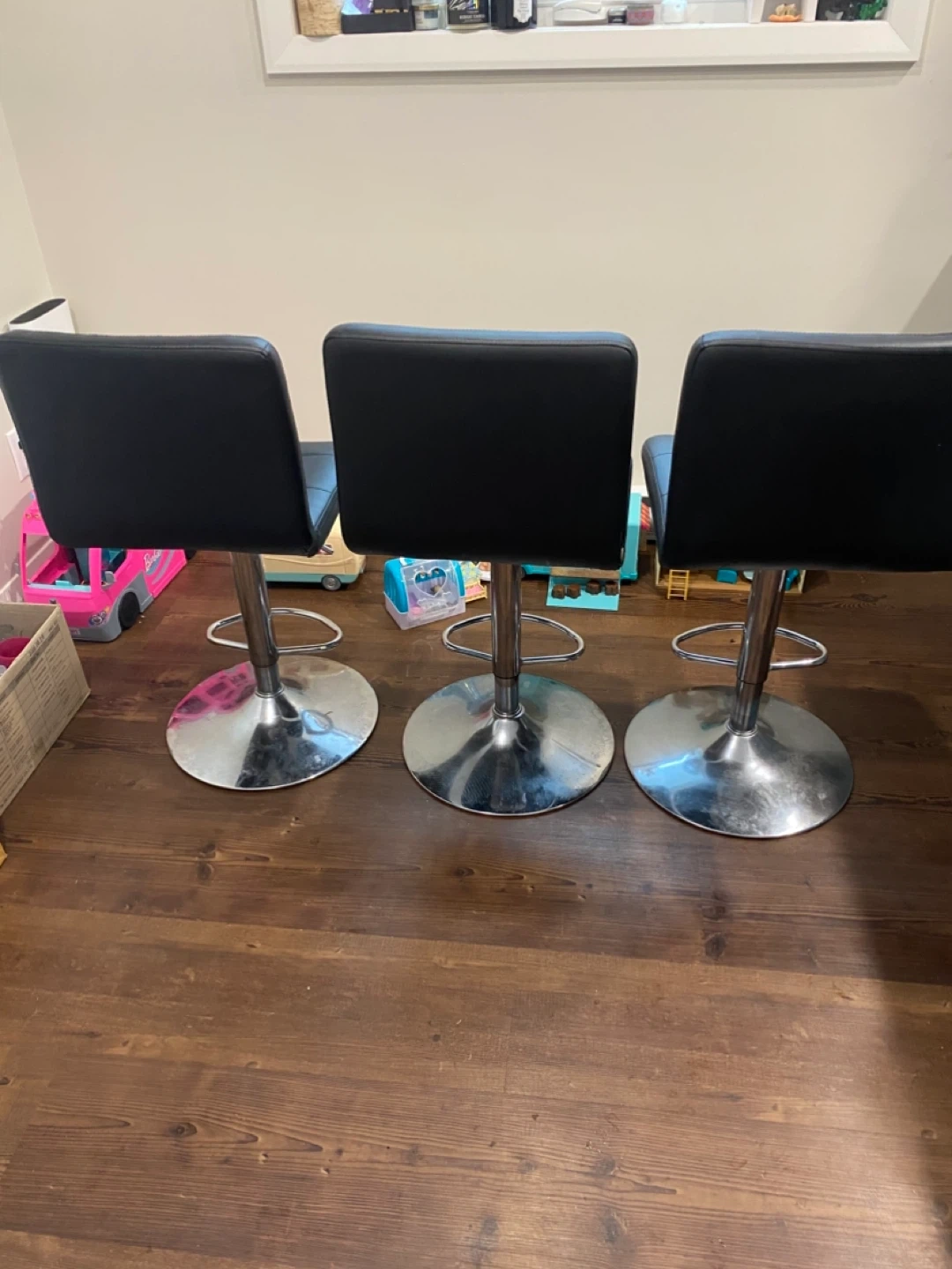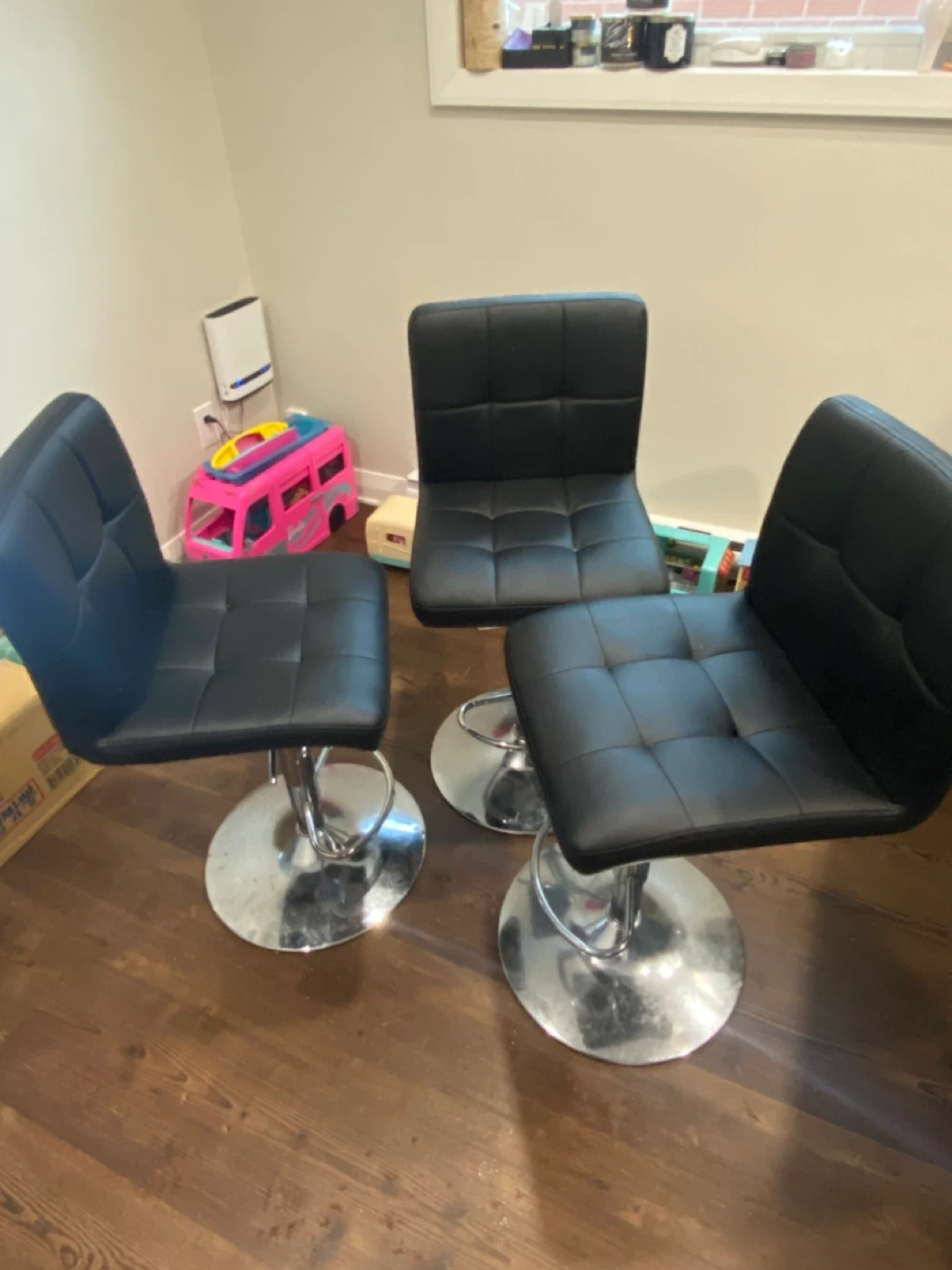 Selling a set of three black adjustable bar stools as-is. They feature a sleek, modern design with tufted seats and polished chrome bases. Minor wear and tear visible but otherwise fully fictional or can be covered with a chair slip.