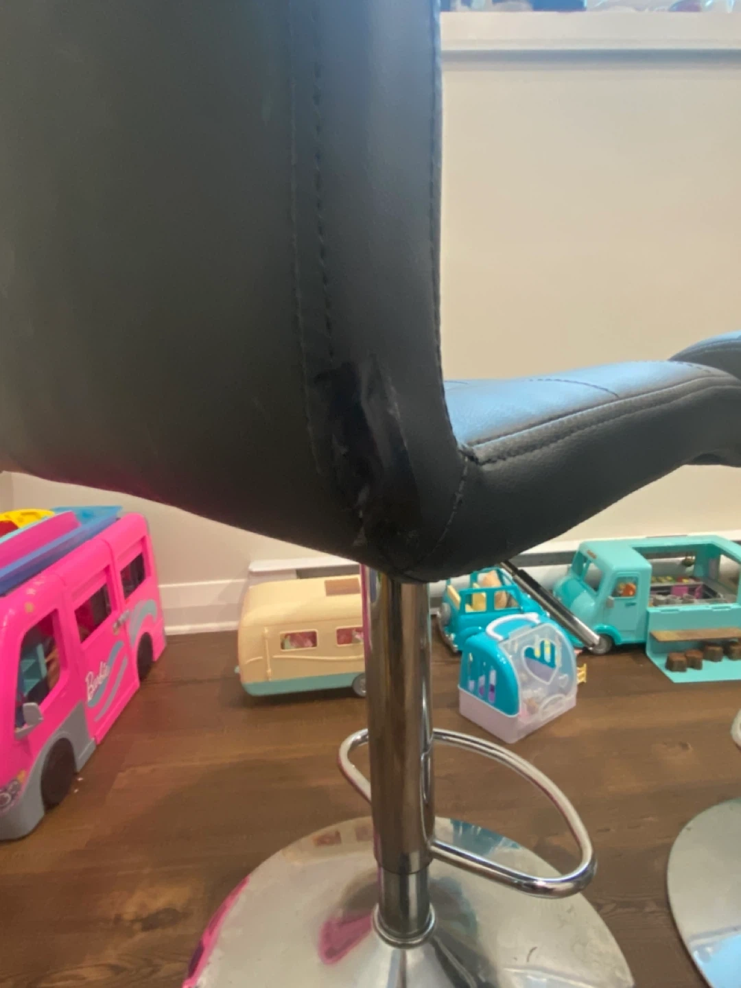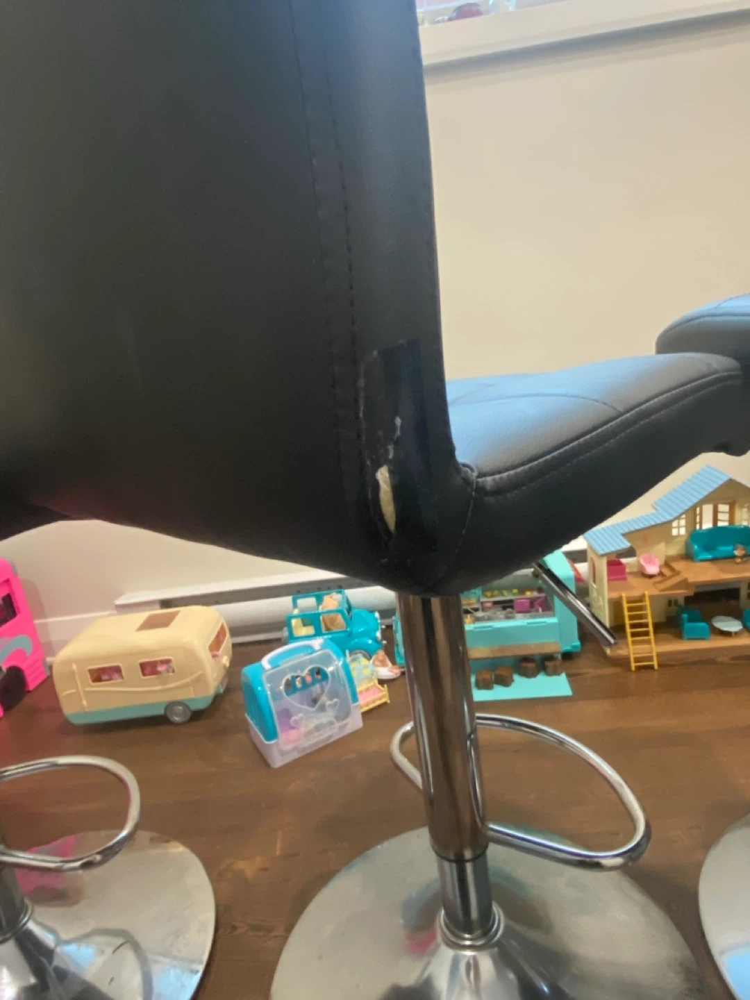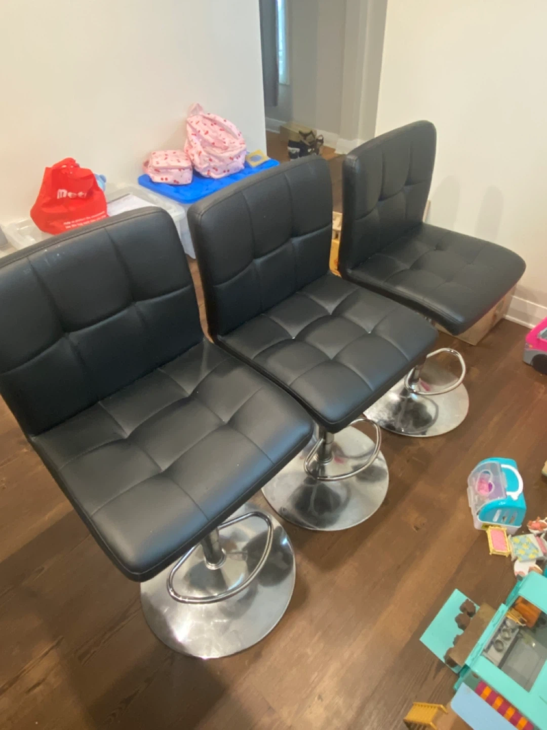 Selling a set of three black adjustable bar stools as-is. They feature a sleek, modern design with tufted seats and polished chrome bases. Minor wear and tear visible but otherwise fully fictional or can be covered with a chair slip.