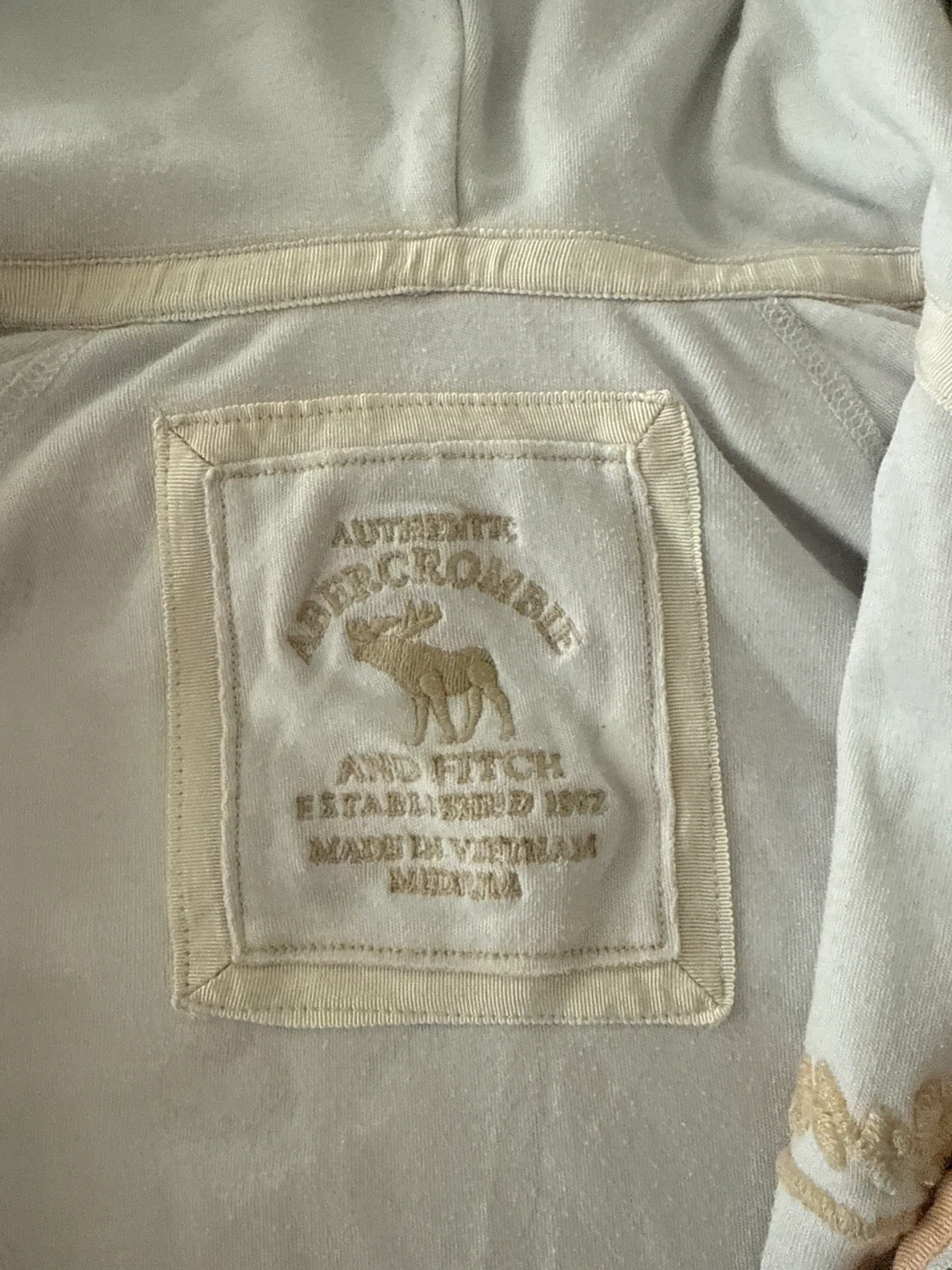 This is a light blue zip-up hoodie from Abercrombie & Fitch. It's a size medium and made in Vietnam. The hoodie features the brand's classic logo embroidered on the chest.