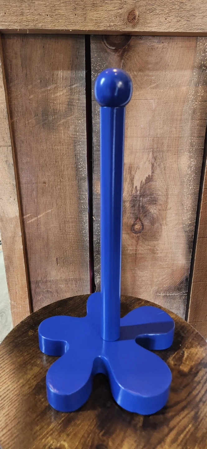 A bright blue paper towel holder with a fun flower-shaped base. It's made of sturdy material and will look great in your kitchen. Perfect for holding standard-sized paper towel rolls!