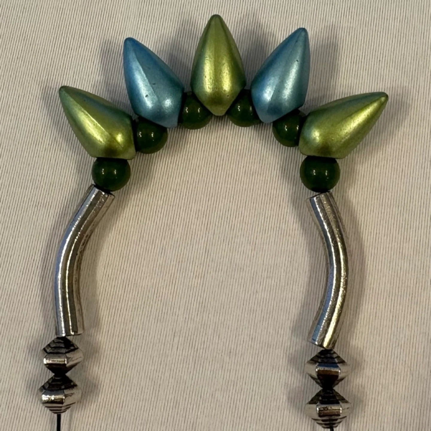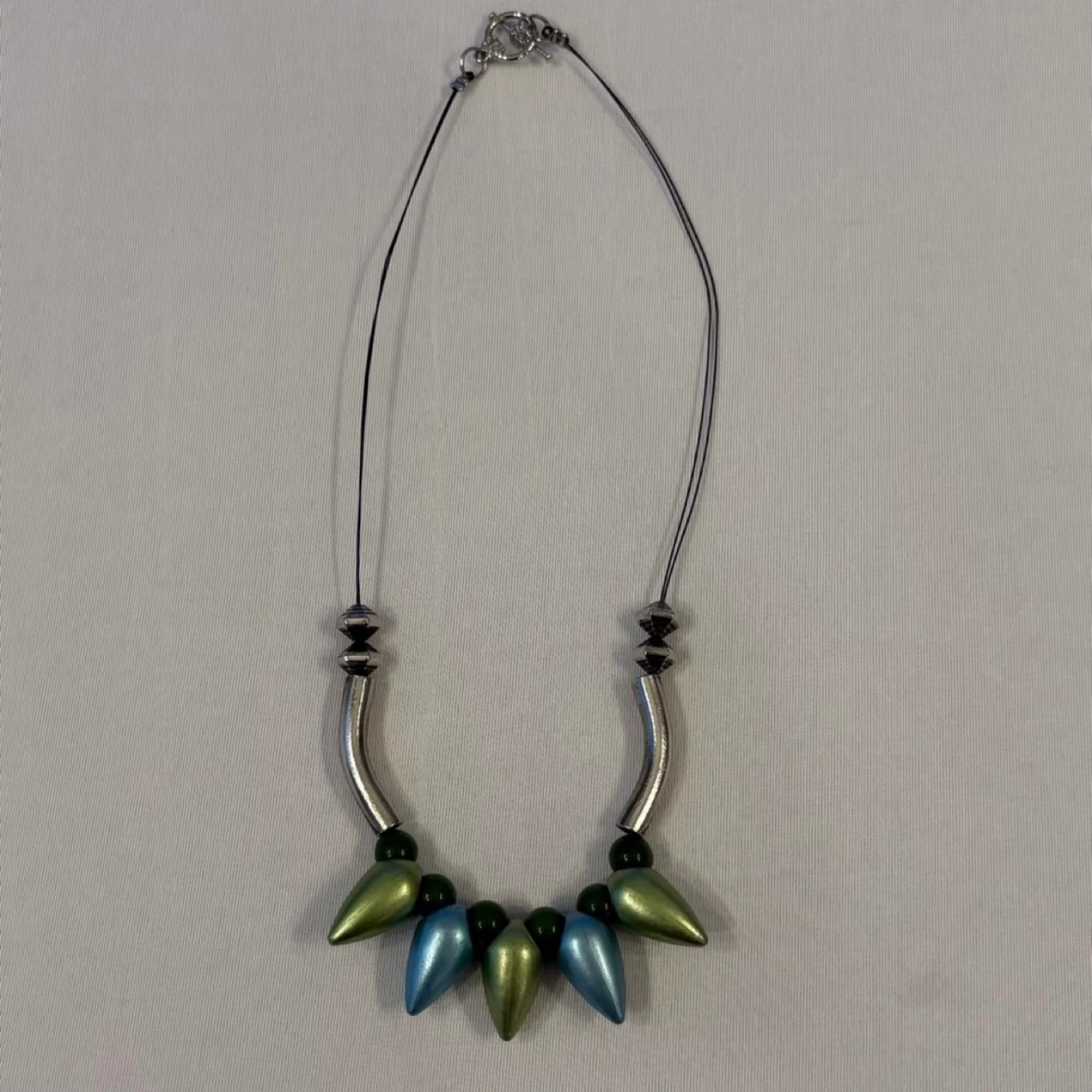 Statement necklace, collar necklace, mod, abstract, spike bead, teardrop, metallic, green, blue, silver tone, unique, art to wear, bold, chunky, toggle clasp