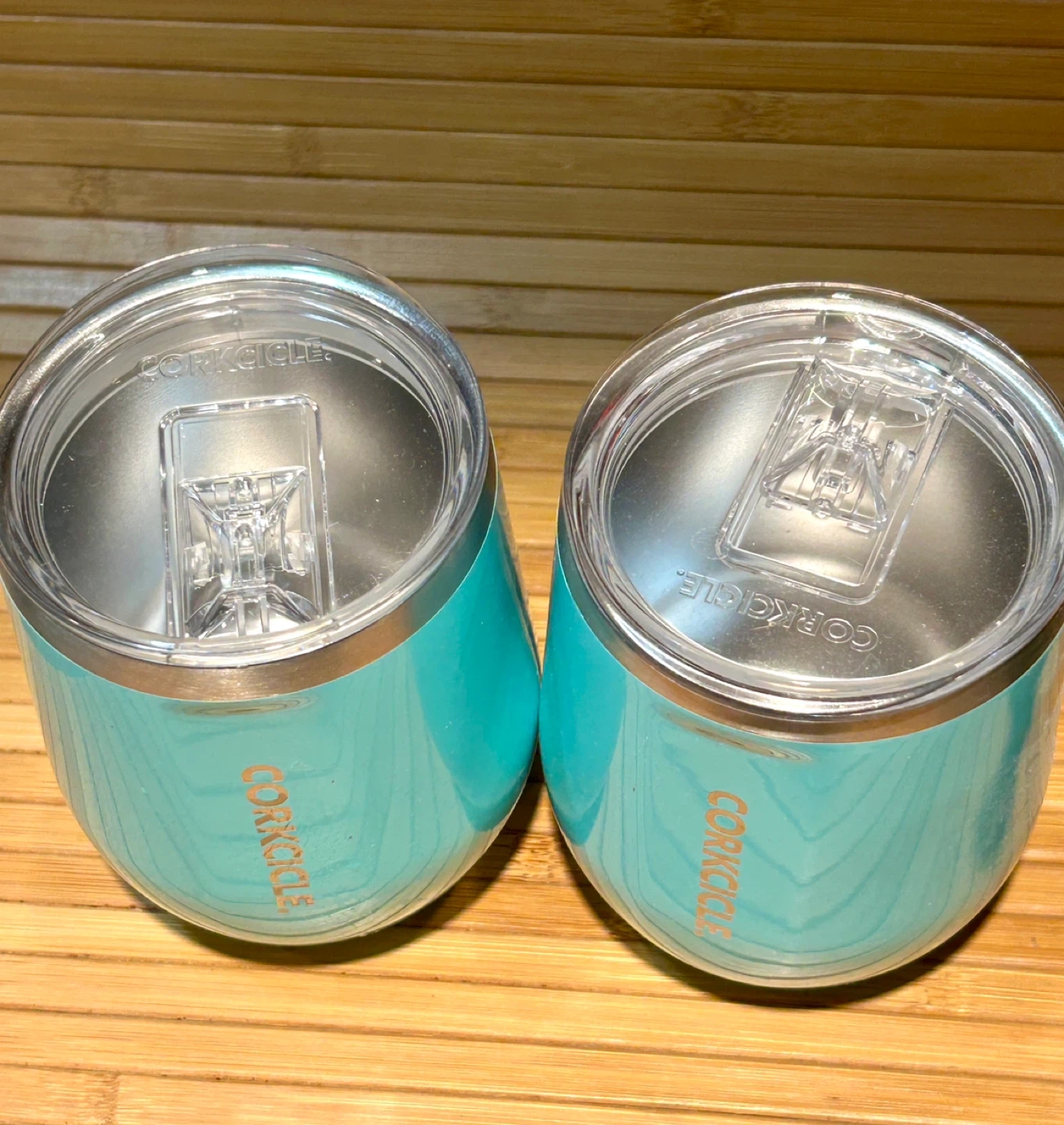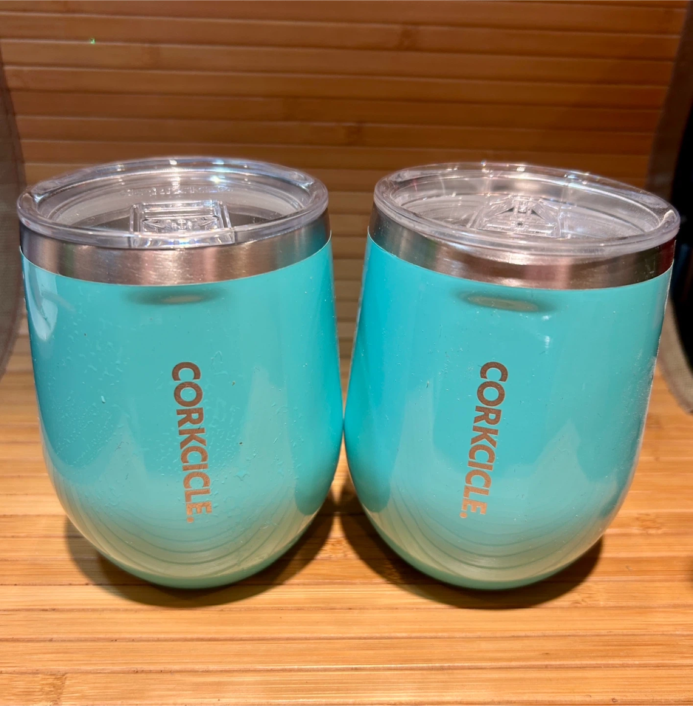Set of two turquoise Corkcicle tumblers. These tumblers feature a stemless design and come with clear lids. They're perfect for keeping drinks cold or hot.