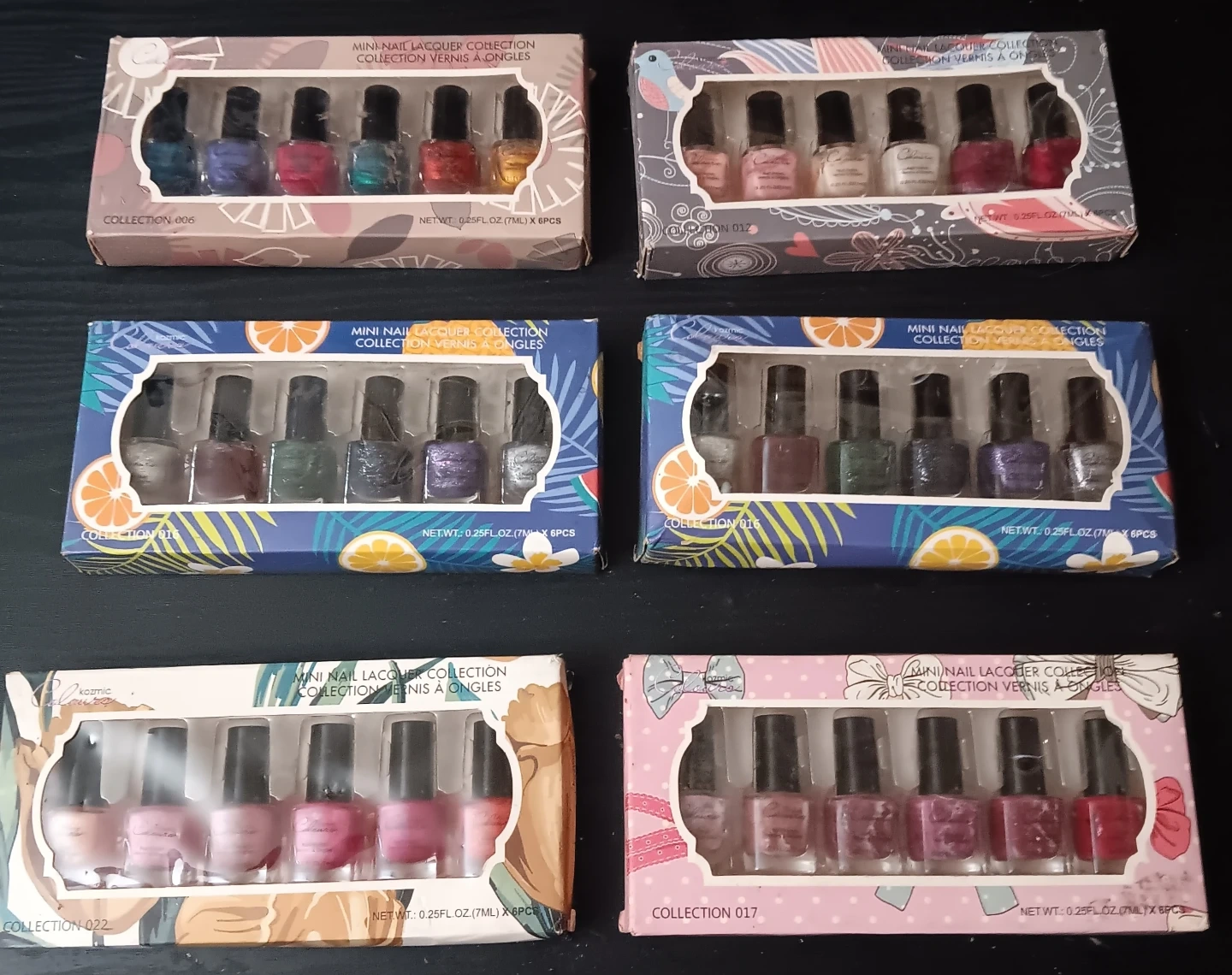 Mini nail lacquers polish for sale!, includes 6 different colors. The net weight for each bottle is 0.25 fl oz (7ml). Available collections include multiple colors 006, 016, 017, and 022. Look Great on nails