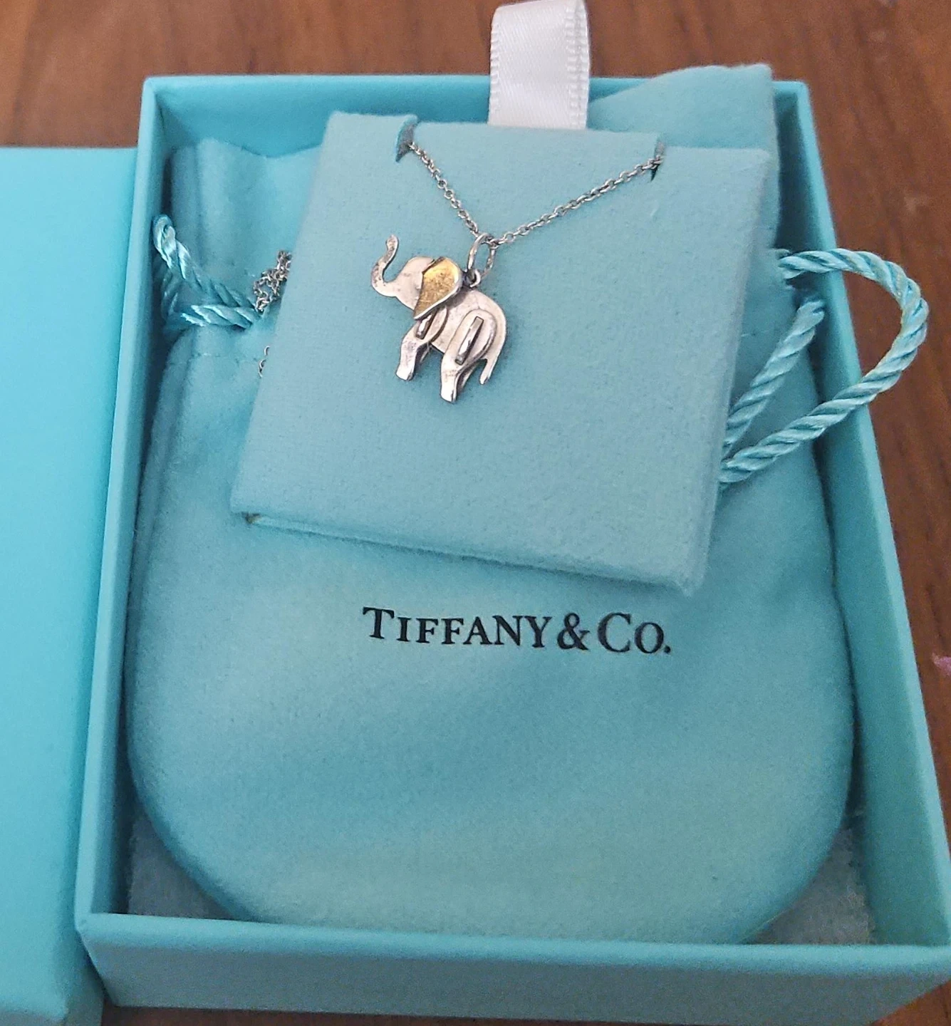 This is a sterling silver elephant pendant necklace from Tiffany & Co. It comes with its original box and pouch. The pendant has a gold accent on its ears. Perfect for any jewelry collection!