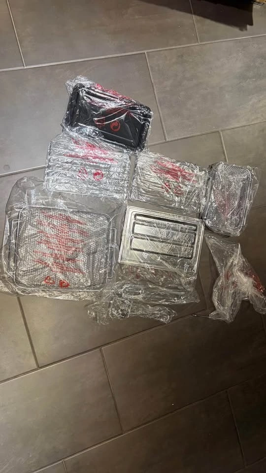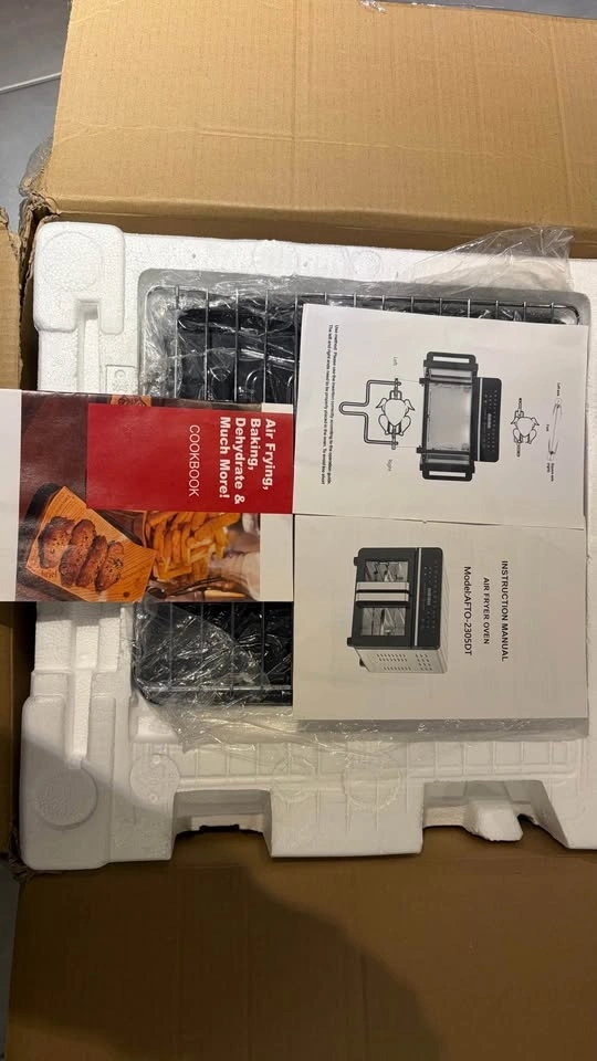 Versatile Fleislecker dual zone air fryer with two separate cooking zones, allowing you to cook different foods at different temperatures. Features a digital display with preset options like air fry, roast, bake, and dehydrate. Also includes sync finish and dual cook functions. Super clean inside. Model AFTO-2305DT.