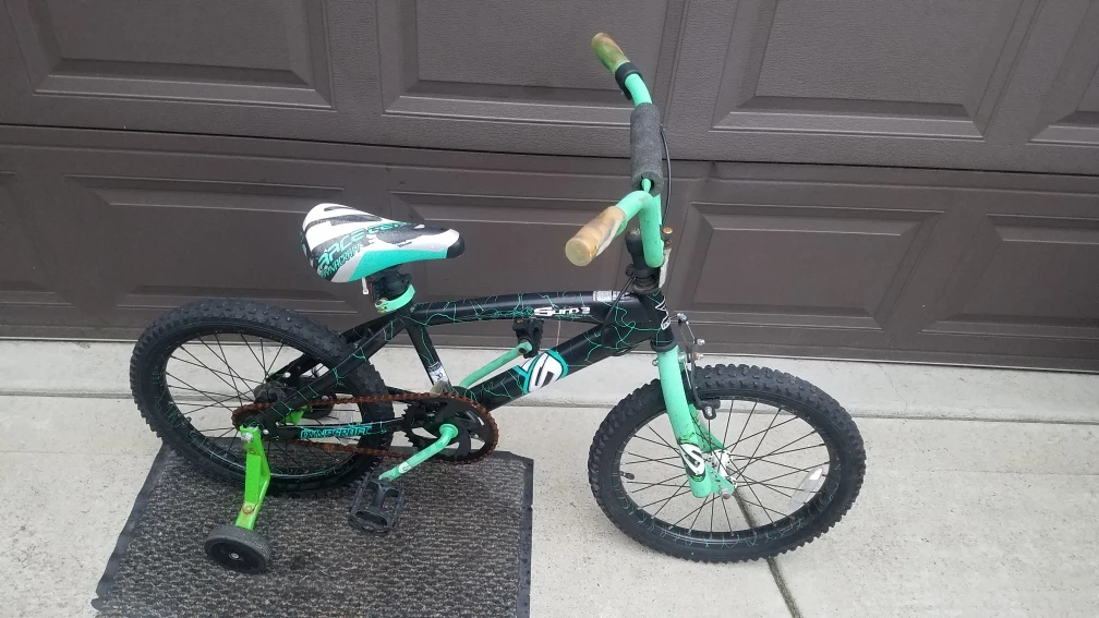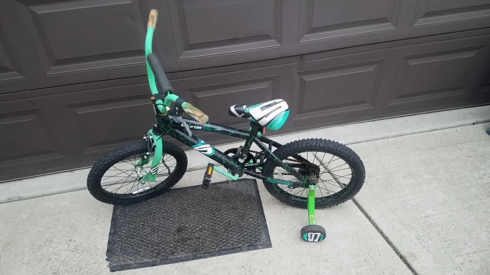 This is a green and black BMX-style bike. It features a durable frame with teal accents. Training wheels are included for stability. This bike is ready for adventures!