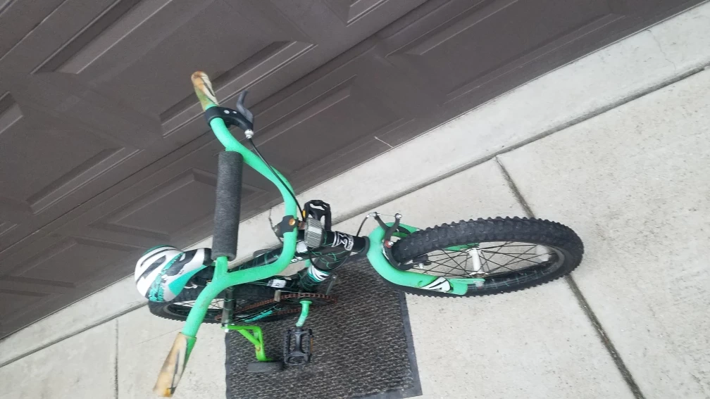 This is a green and black BMX-style bike. It features a durable frame with teal accents. Training wheels are included for stability. This bike is ready for adventures!