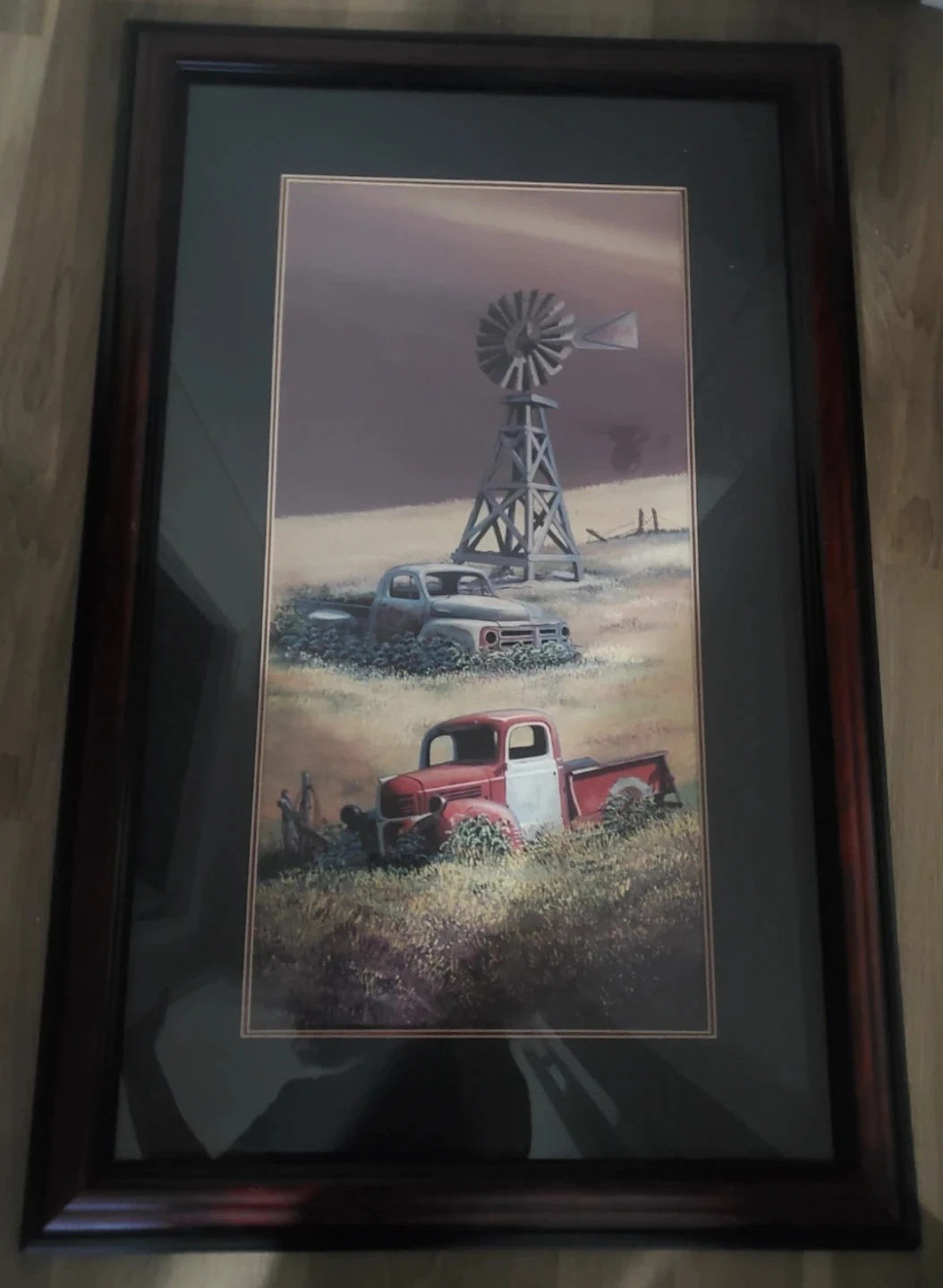 A framed art print featuring a rustic scene with vintage trucks and a windmill. The artwork is housed in a dark wood frame. It's a lovely piece for any country or farmhouse decor enthusiast!