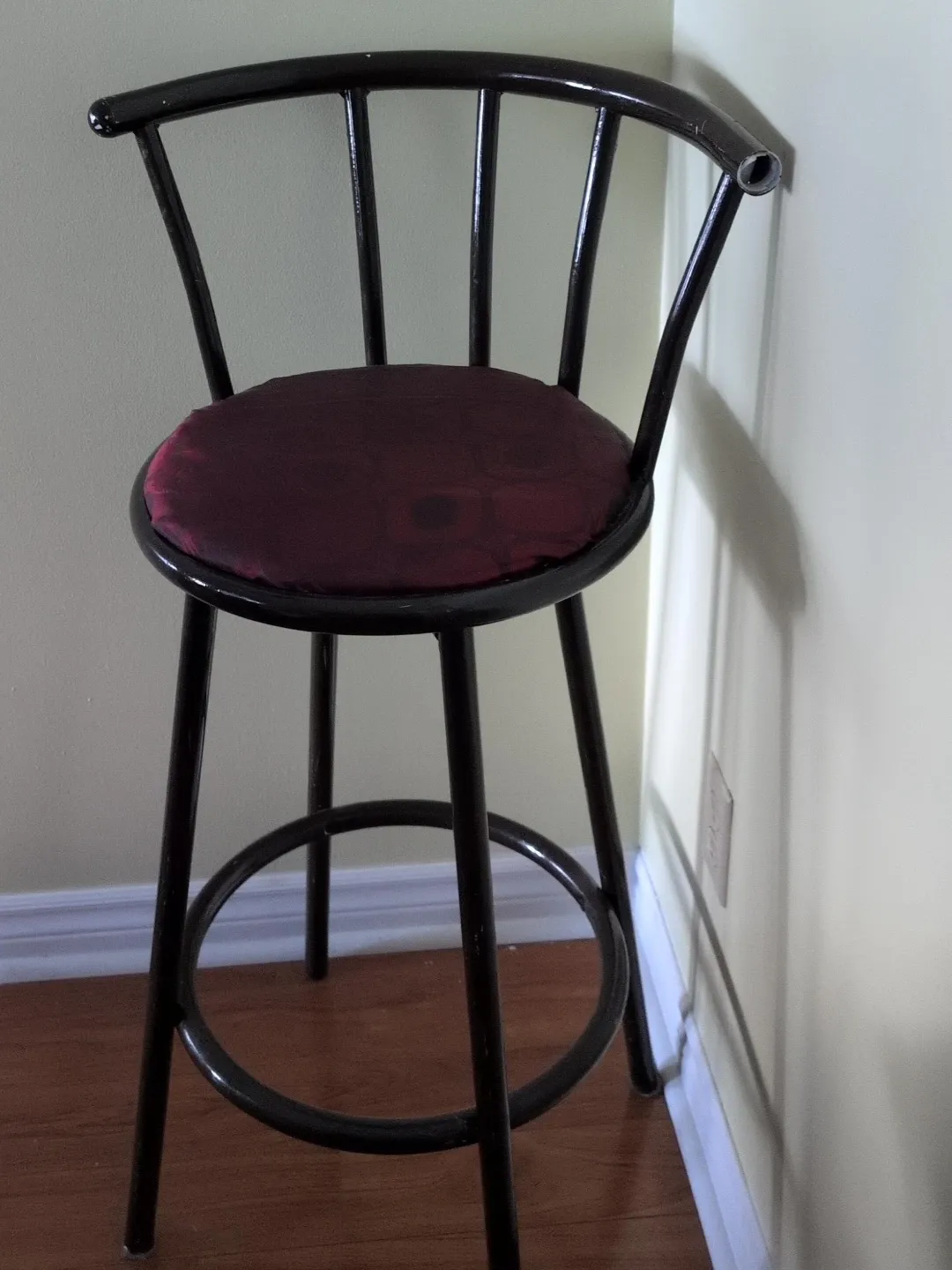 This is a black metal bar stool featuring a plush burgundy fabric seat cushion. It has a footrest ring for added comfort. It's a great addition to any kitchen island or home bar! Buy as it I have four stools 60 dollars 15dollars each