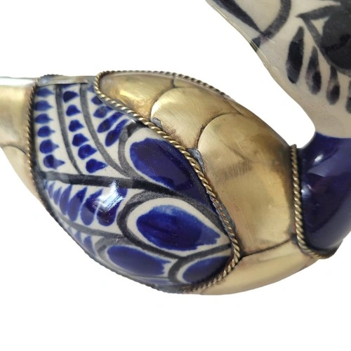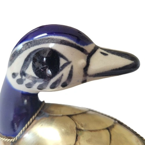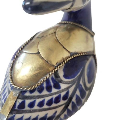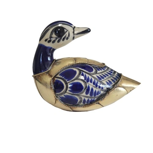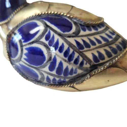 Beautiful blue and white ceramic duck from Tonala, Mexico, featuring decorative brass feathers. A lovely piece for your home decor.