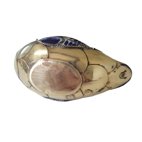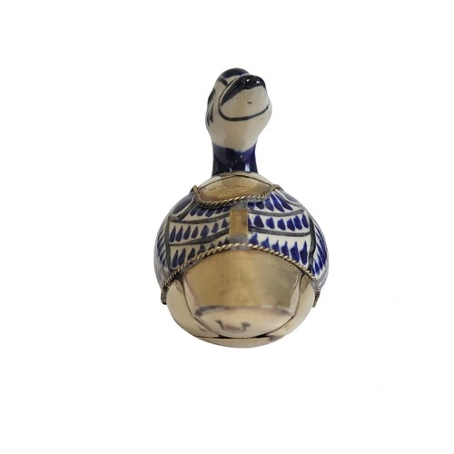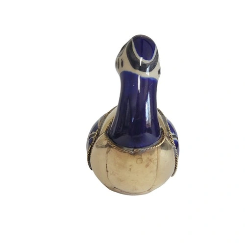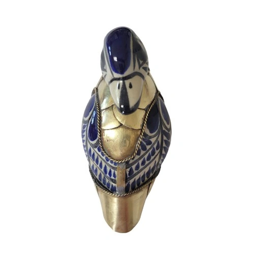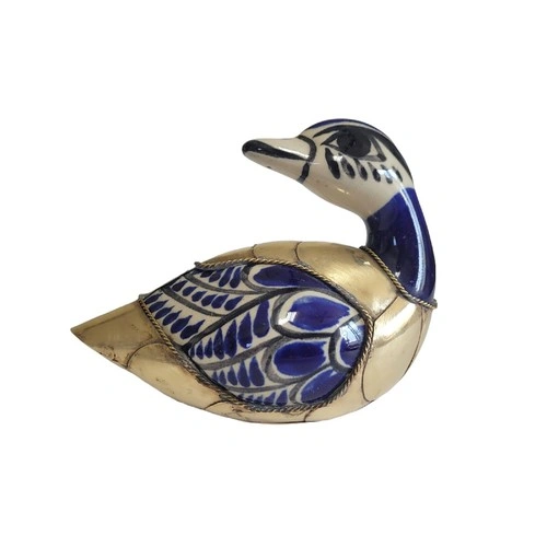 Beautiful blue and white ceramic duck from Tonala, Mexico, featuring decorative brass feathers. A lovely piece for your home decor.