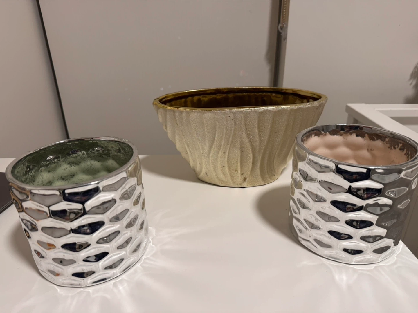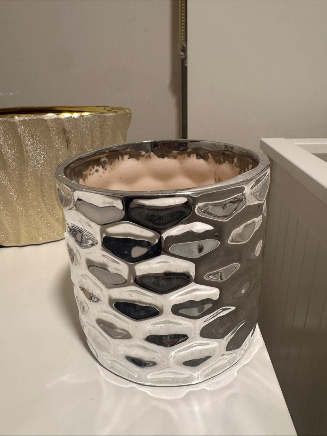 Stylish silver plant pot with a textured, honeycomb-like design. It's perfect for adding a touch of modern flair to your home decor. This pot would look great holding a small houseplant!Each $5