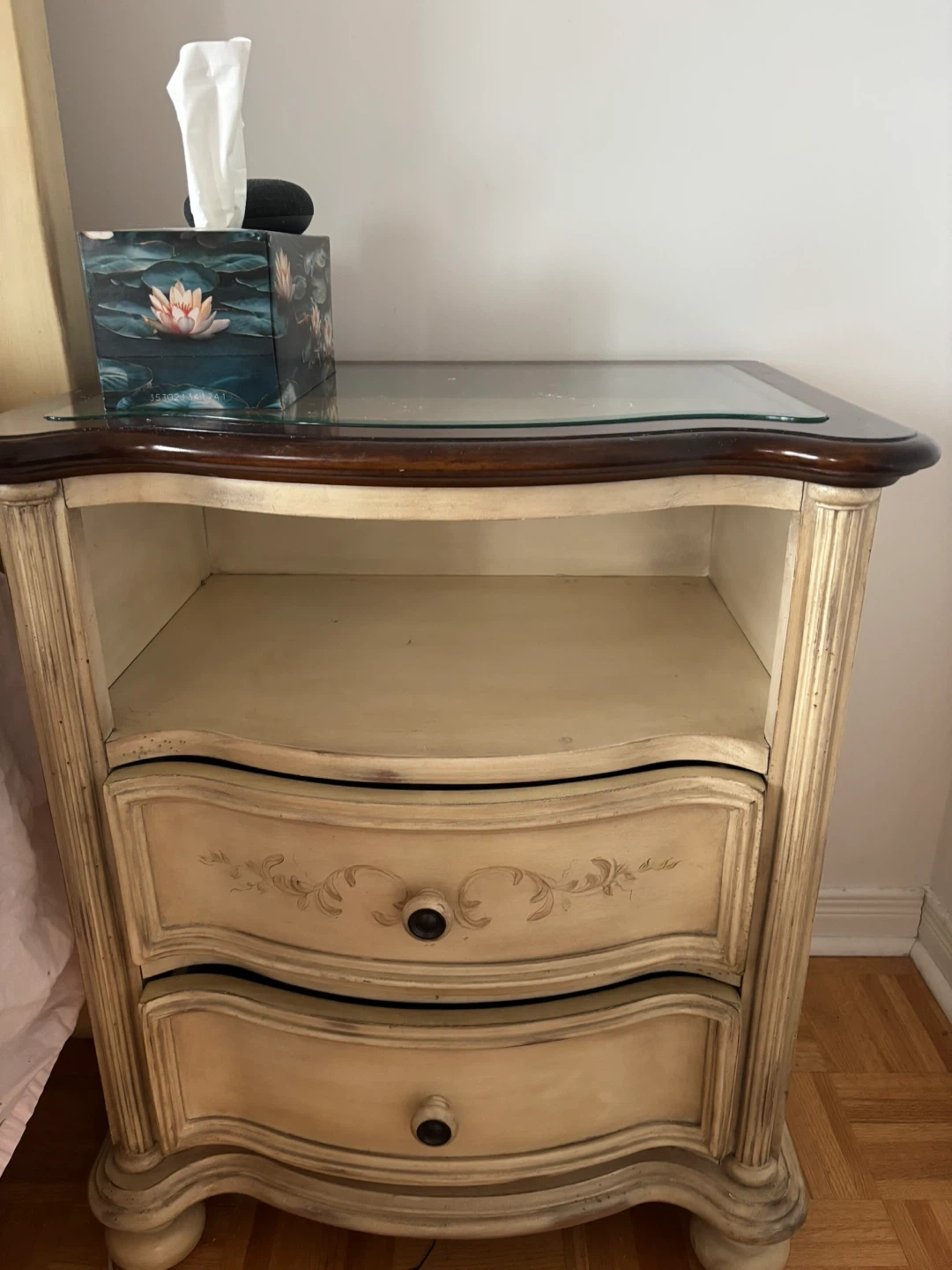Cream coloured bedroom set with dresser and nightstands