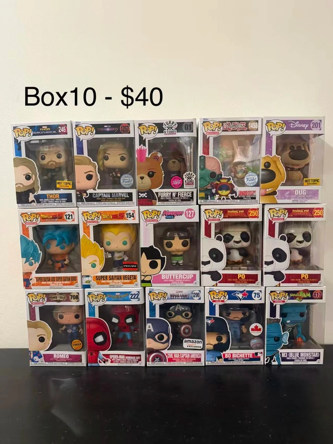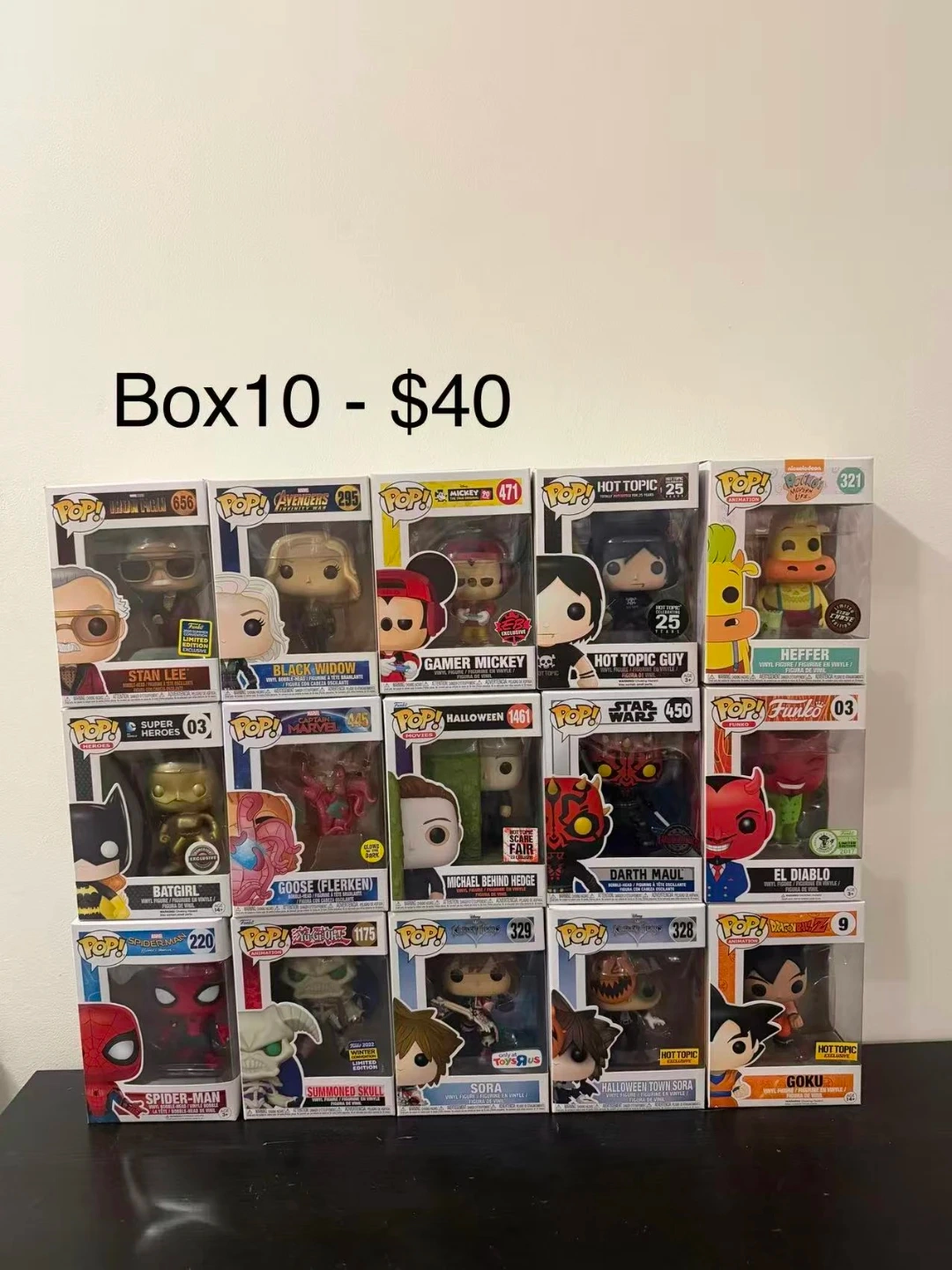 Collection of various Funko Pop figures including characters from Marvel, Star Wars, Disney, and more. Figures are in their original boxes, ready for display. Perfect for collectors of pop culture memorabilia!