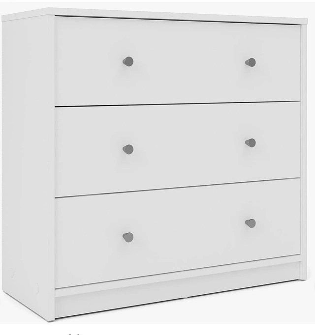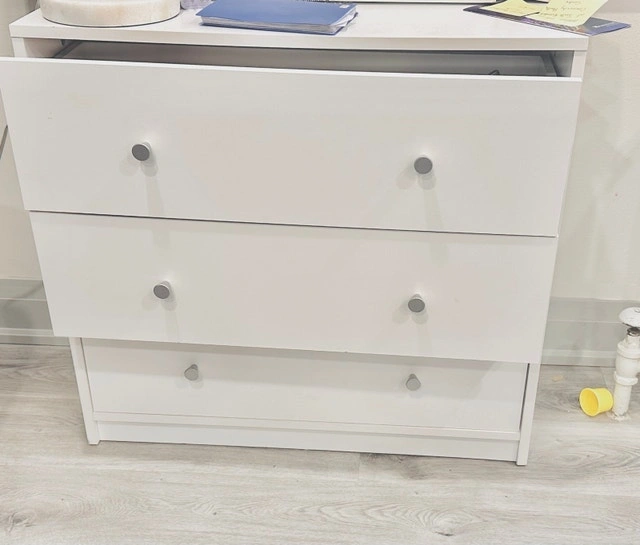 This is a used white dresser with three drawers, offering ample storage space for your clothing and accessories. It's in good condition and ready to organize your room! Colour: White, Number of Drawers: 3, Material: Wood. Cash accepted.