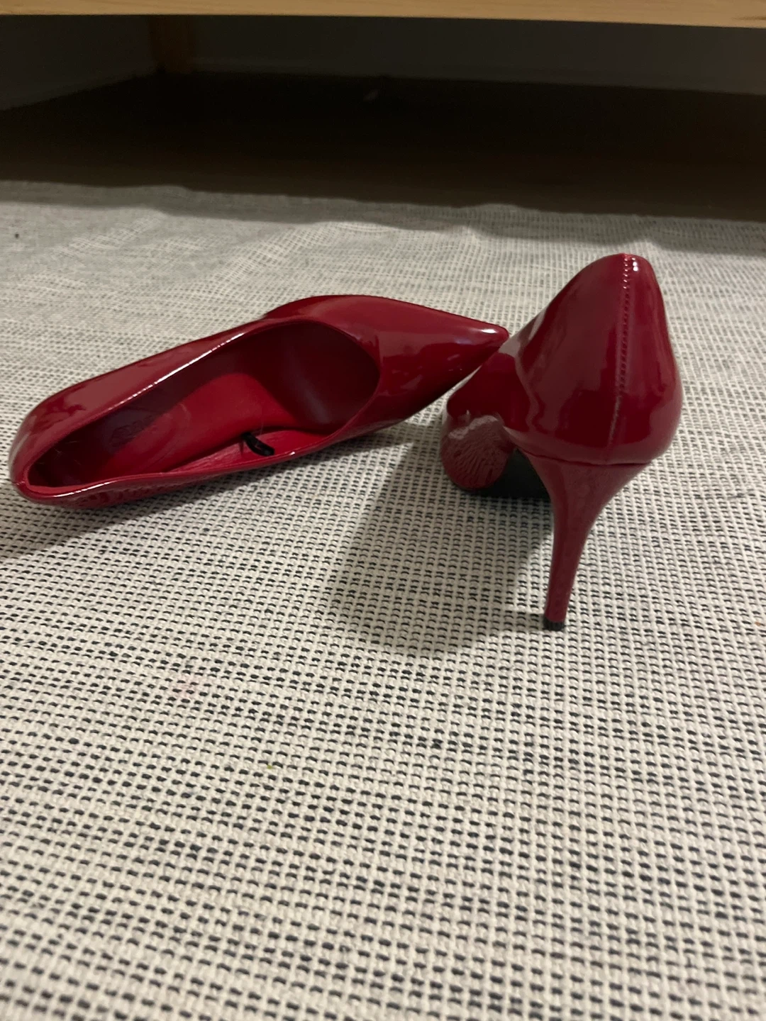 These are a pair of red patent stiletto pumps. They have a pointed toe and a slim heel. These shoes would be suitable for dressing up an outfit. Have a little scratch on the right heel. Was bought for 50% and worn for one night , size ended up being too big.