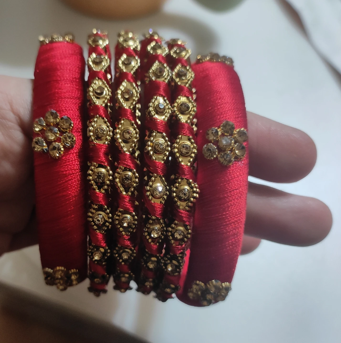 Red Silk Thread Bangles with Rhinestone Embellishments