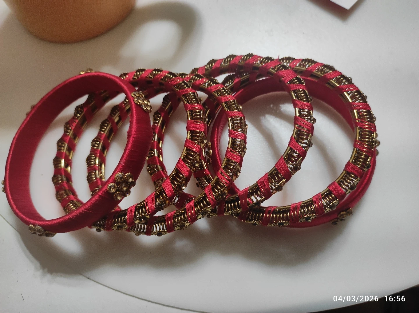 A set of vibrant red silk thread bangles, adorned with intricate gold-tone metal accents and sparkling rhinestones. These bangles are designed with a traditional feel and are sure to add a pop of colour to any outfit. They're perfect for festive occasions or cultural events.