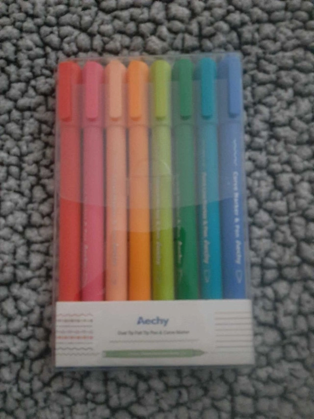 Unleash your inner artist with this Aechy Dual Tip Felt Pen & Curve Marker set, perfect for adding colourful flair to any project! This set is new, still sealed in its original packaging, and ready to bring your creative visions to life. * Dual tip design: fine point and curve marker * Vibrant array of colours * Neat and precise lines Remember, if the ad is still up, the pens are ready for a new home!
