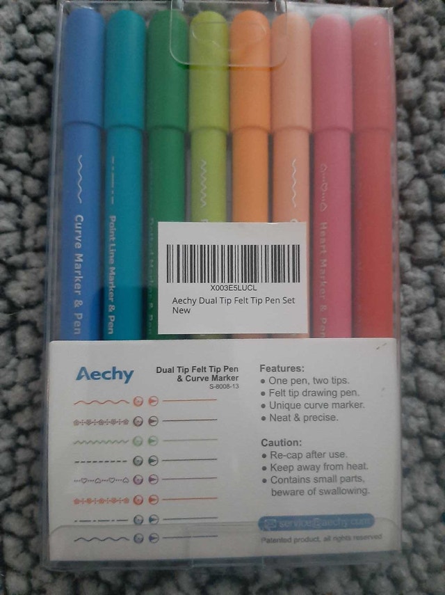 Unleash your inner artist with this Aechy Dual Tip Felt Pen & Curve Marker set, perfect for adding colourful flair to any project! This set is new, still sealed in its original packaging, and ready to bring your creative visions to life. * Dual tip design: fine point and curve marker * Vibrant array of colours * Neat and precise lines Remember, if the ad is still up, the pens are ready for a new home!