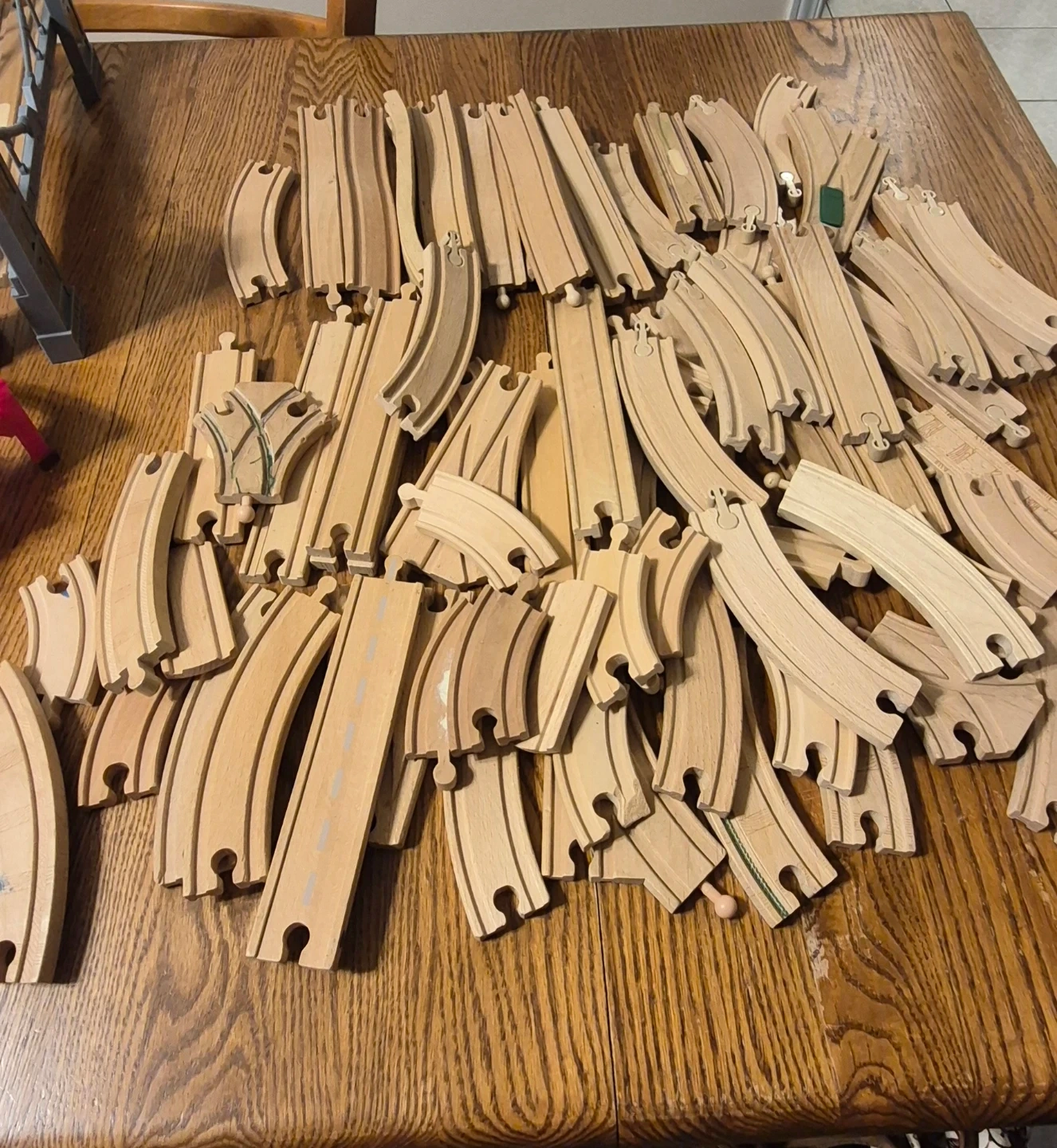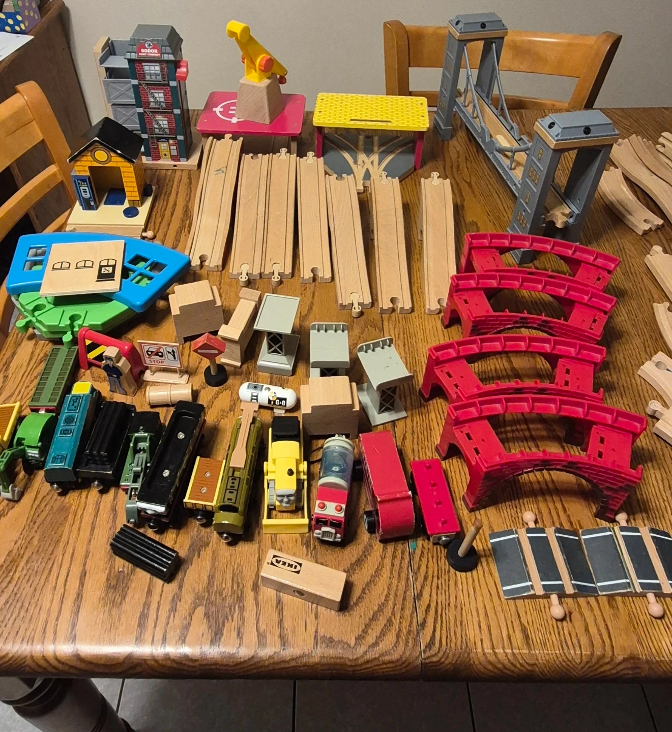 A large collection of wooden train tracks and assorted accessories for endless play possibilities. Includes straight and curved pieces, bridges, buildings, and trains. Great for building custom layouts!