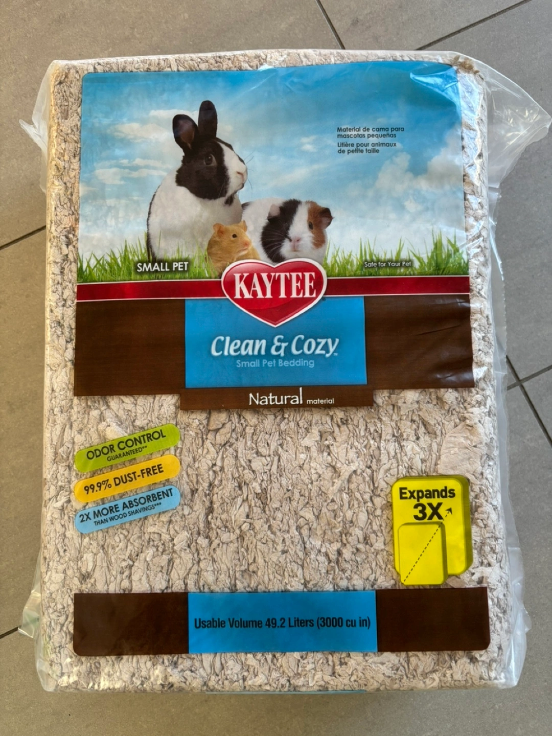 Natural material small pet bedding. Odor control guaranteed. 99.9% dust-free. Expands 3x. Usable volume 49.2 liters (3000 cu in).