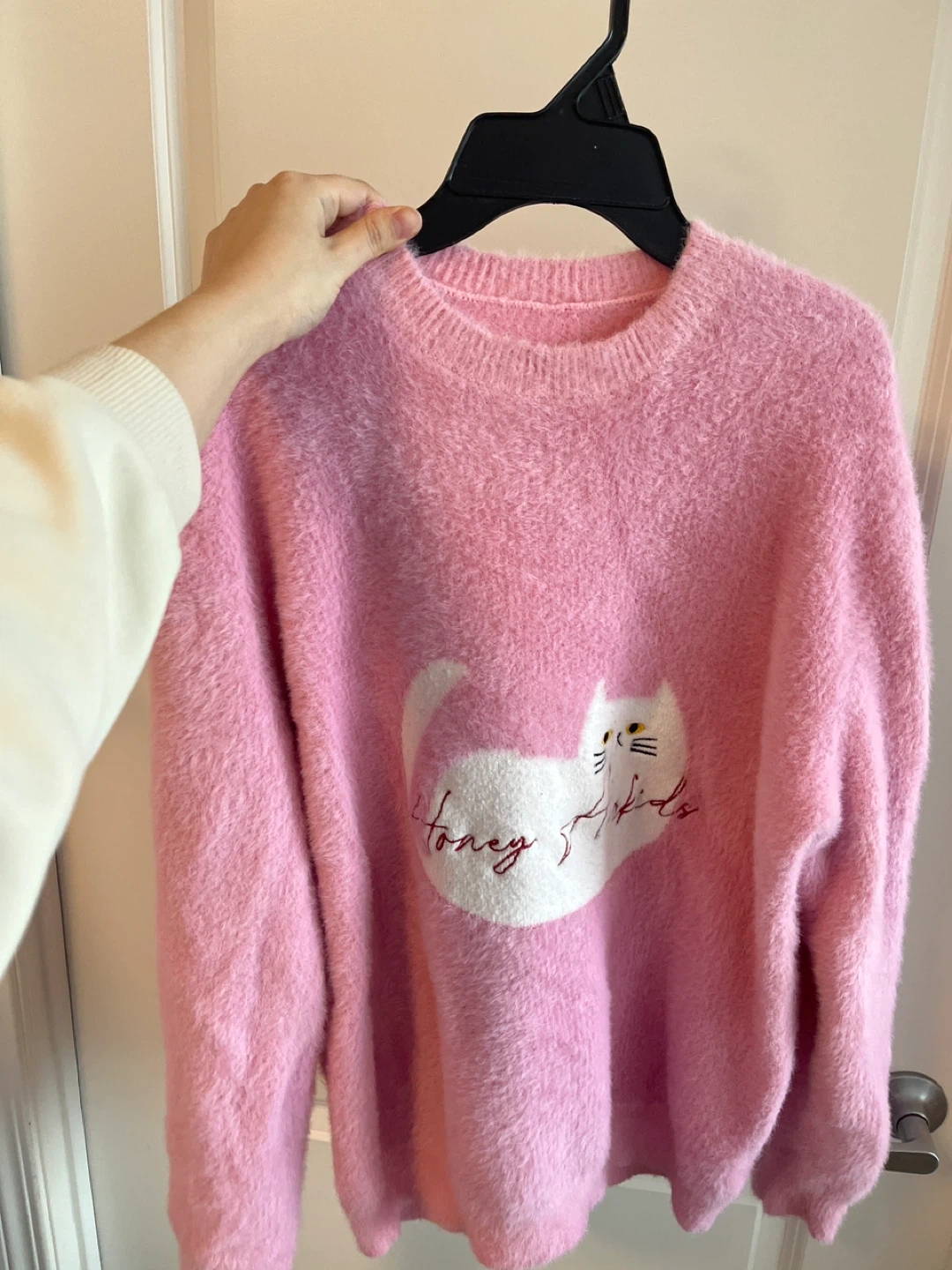 This fuzzy pink sweater features a cute white cat graphic with "honey & kids" embroidered on it. It's super soft and cozy. Great for a casual, fun look!