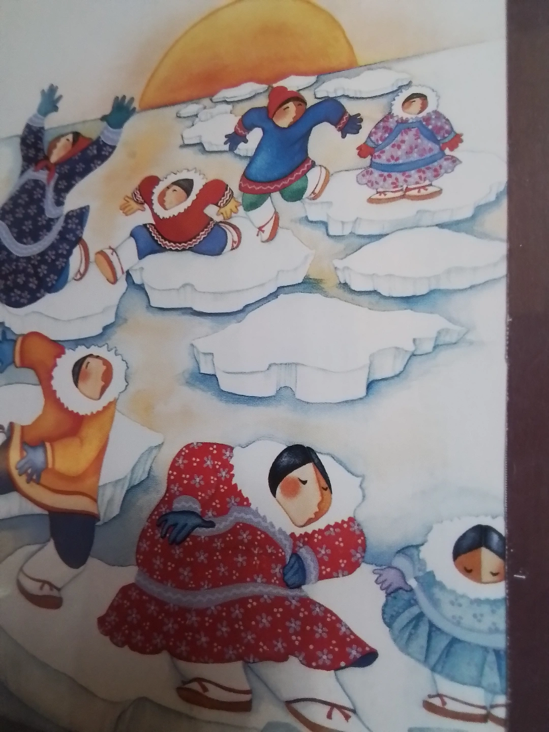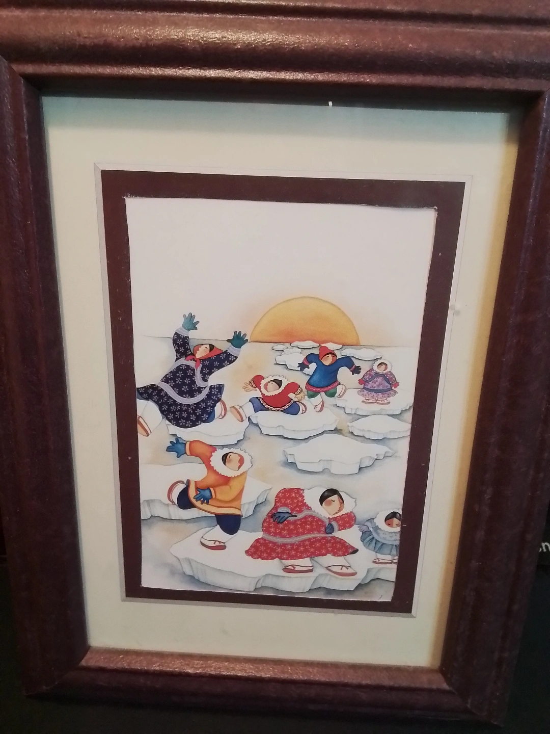 Beautiful framed artwork depicting Inuit children playing on ice floes. Bright colours, charming style. Perfect for a child's room or any space needing a touch of whimsy.