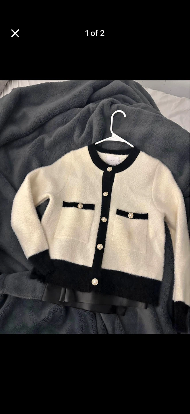Cozy fluffy cream cardigan with contrasting black trim and decorative pearl buttons. It features two faux pocket details with black trim and pearl buttons. A stylish and warm layering piece for cooler days!