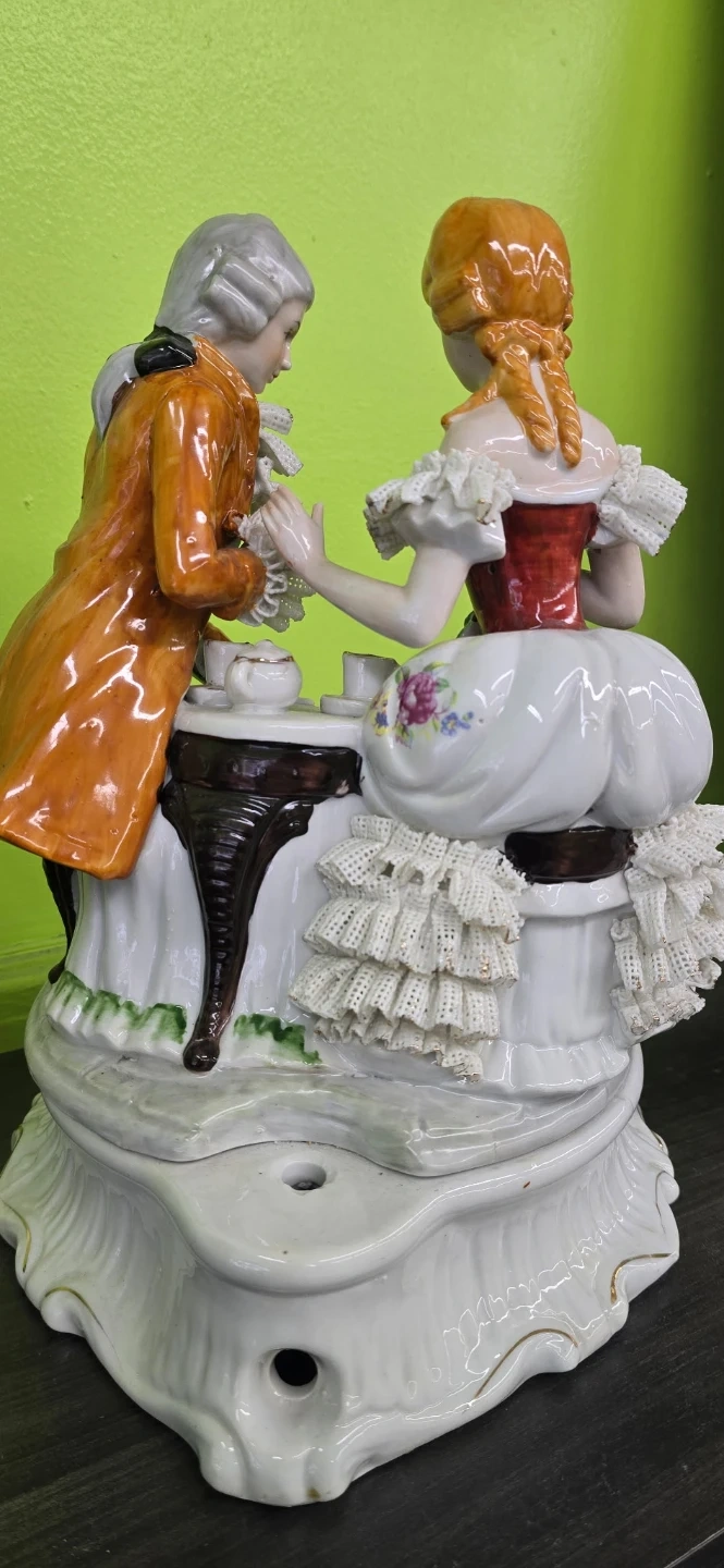 Beautiful vintage porcelain figurine featuring a Victorian-style couple enjoying tea together ☕💐