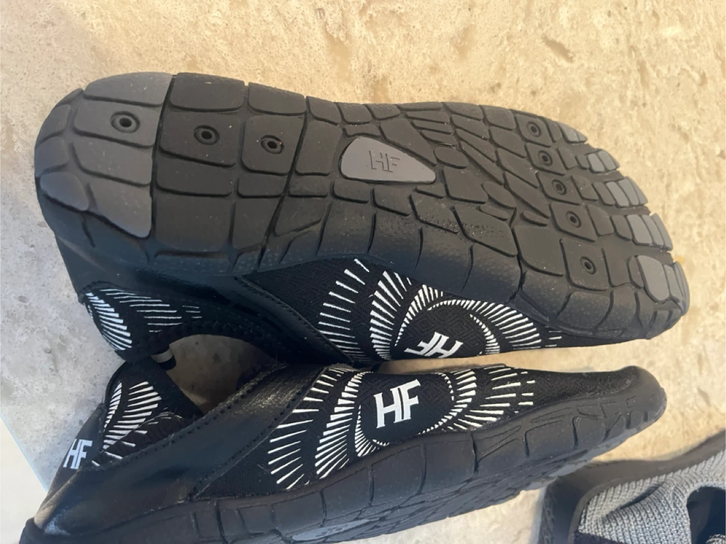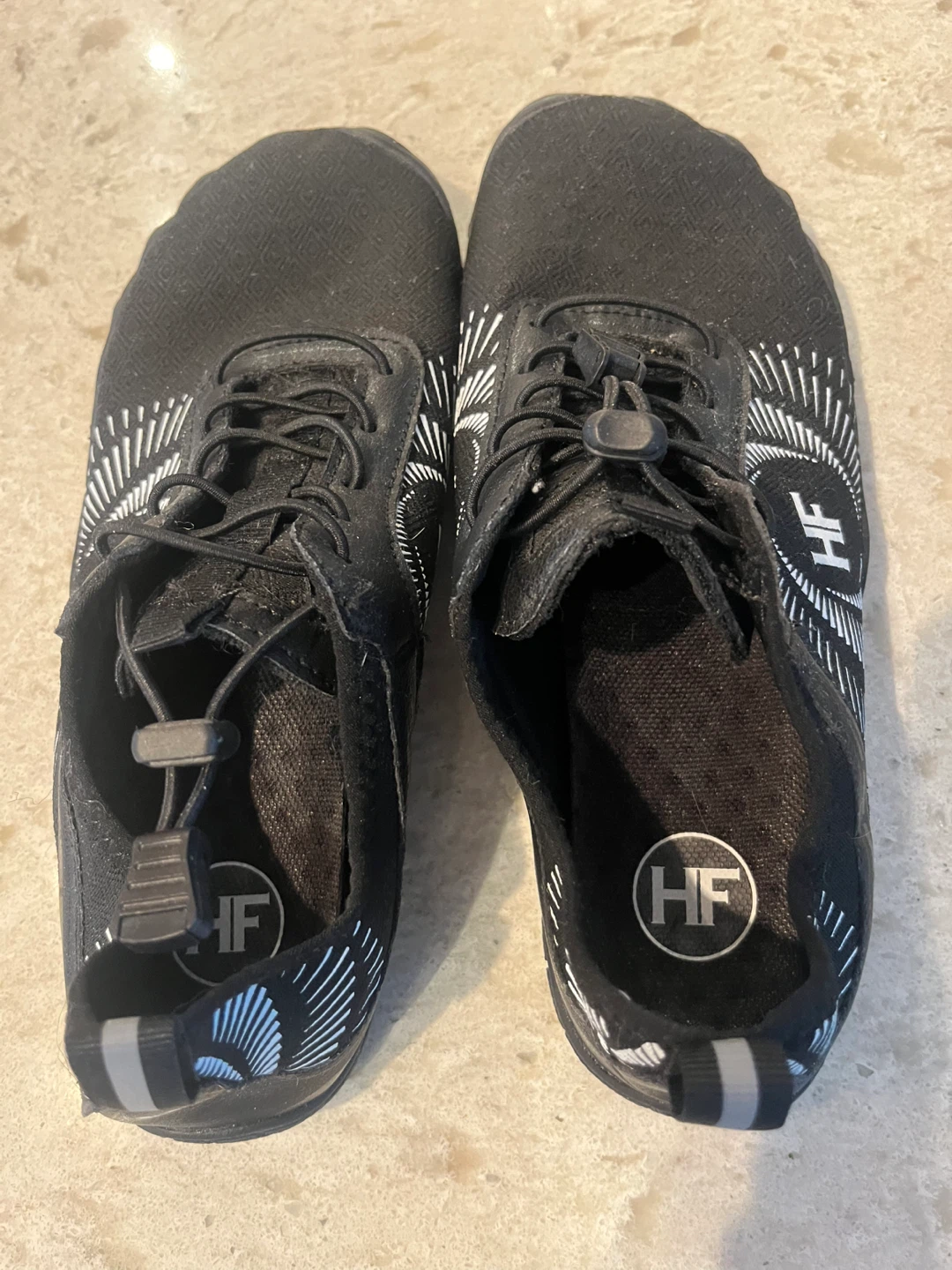 HF brand lifestyle pain relief shoes in black. These shoes are breathable, splash resistant with a quick-lace system for a secure fit. They're made with a flexible, quick-drying fabric. Great for natural foot alignment and posture.