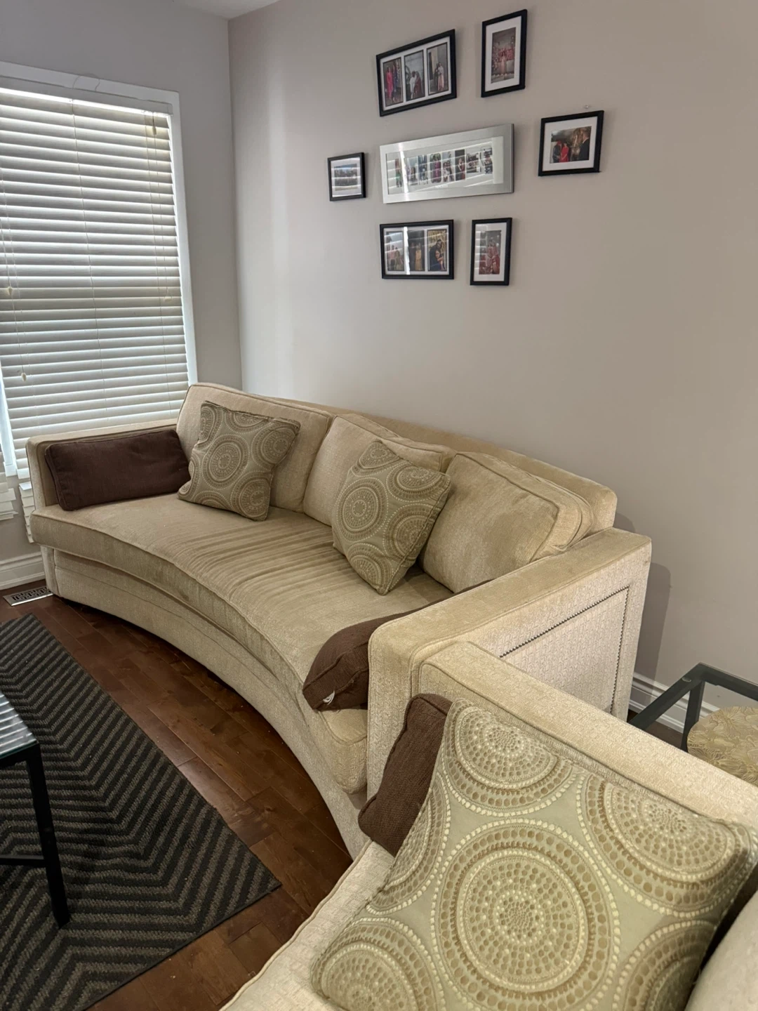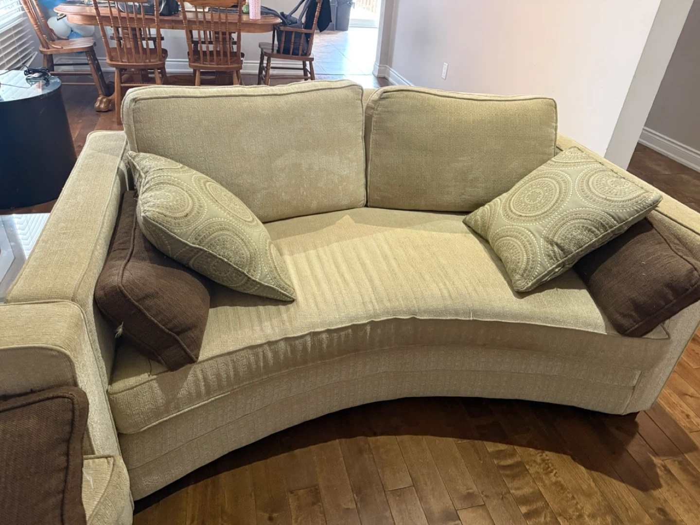 This curved sofa offers ample seating space. It's upholstered in a textured beige fabric and includes decorative throw pillows. Great for a living room!