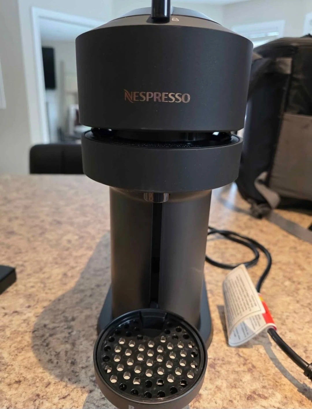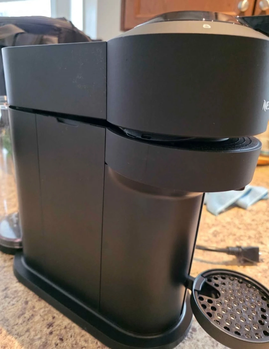 Nespresso Vertuo Next machine in matte black. It brews single-serve coffee and espresso. This machine is easy to use and makes great coffee!