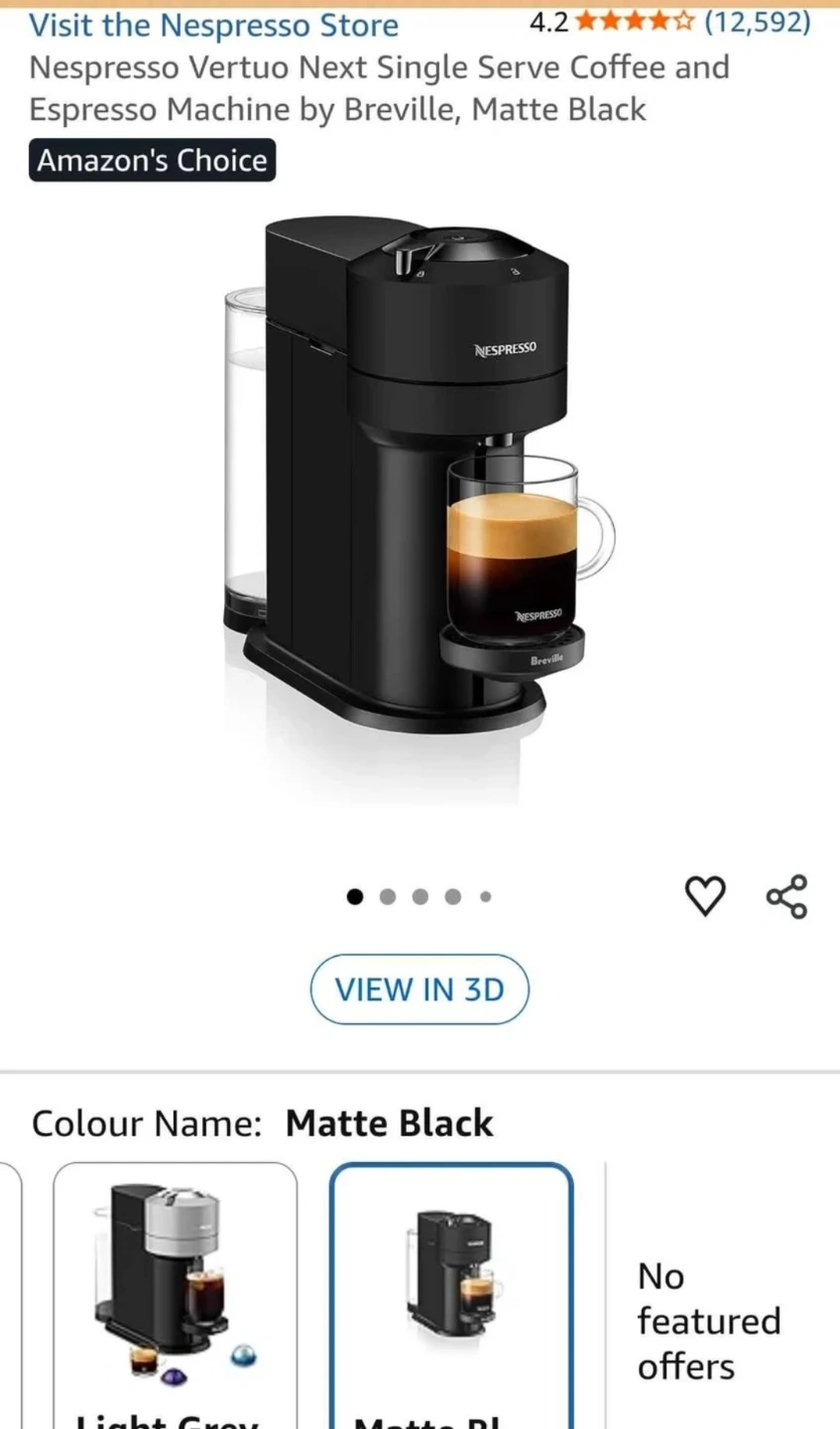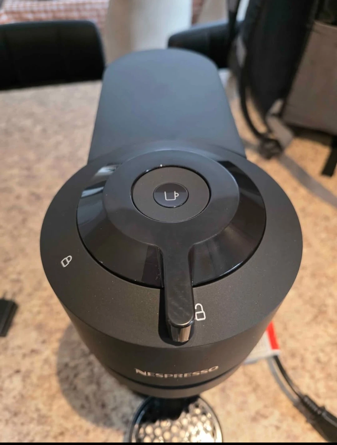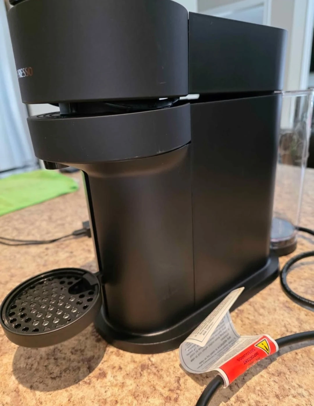 Nespresso Vertuo Next machine in matte black. It brews single-serve coffee and espresso. This machine is easy to use and makes great coffee!
