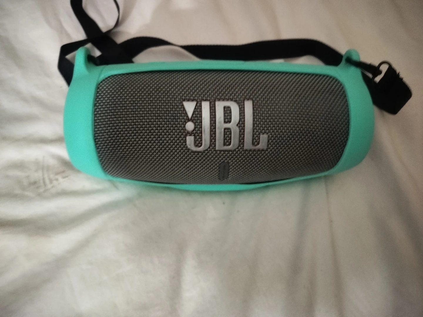 Selling a JBL 5 portable Bluetooth speaker,with a turquoise strap. It's in great shape and ready to bring the tunes! Perfect for taking your music on the go, whether you're at the park or just hanging out at home