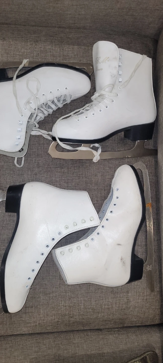 Pair of white figure skates with laces. Blades are silver-toned. A second, smaller pair of white skates is also included. These would be great for someone starting out in figure skating or for recreational ice skating.