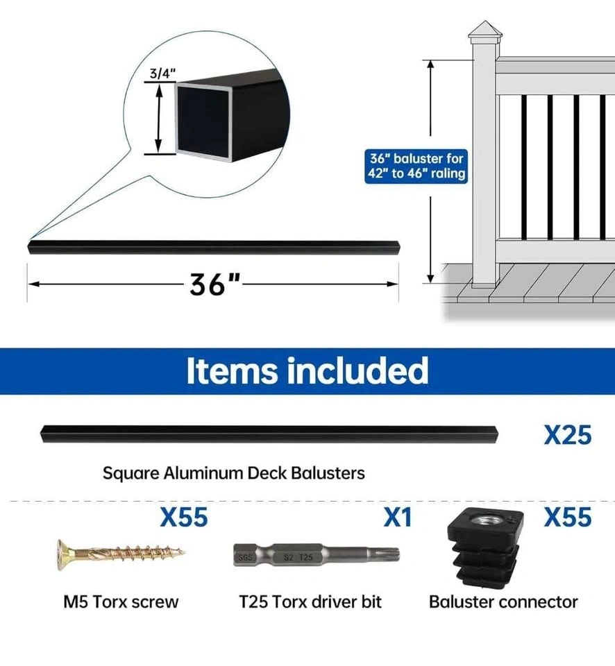 Brand new 50 pack of 36 inch black aluminum deck railing balusters. These are square spindles with a 3/4 inch diameter, hollow for wood and composite decks. WT13 model.
