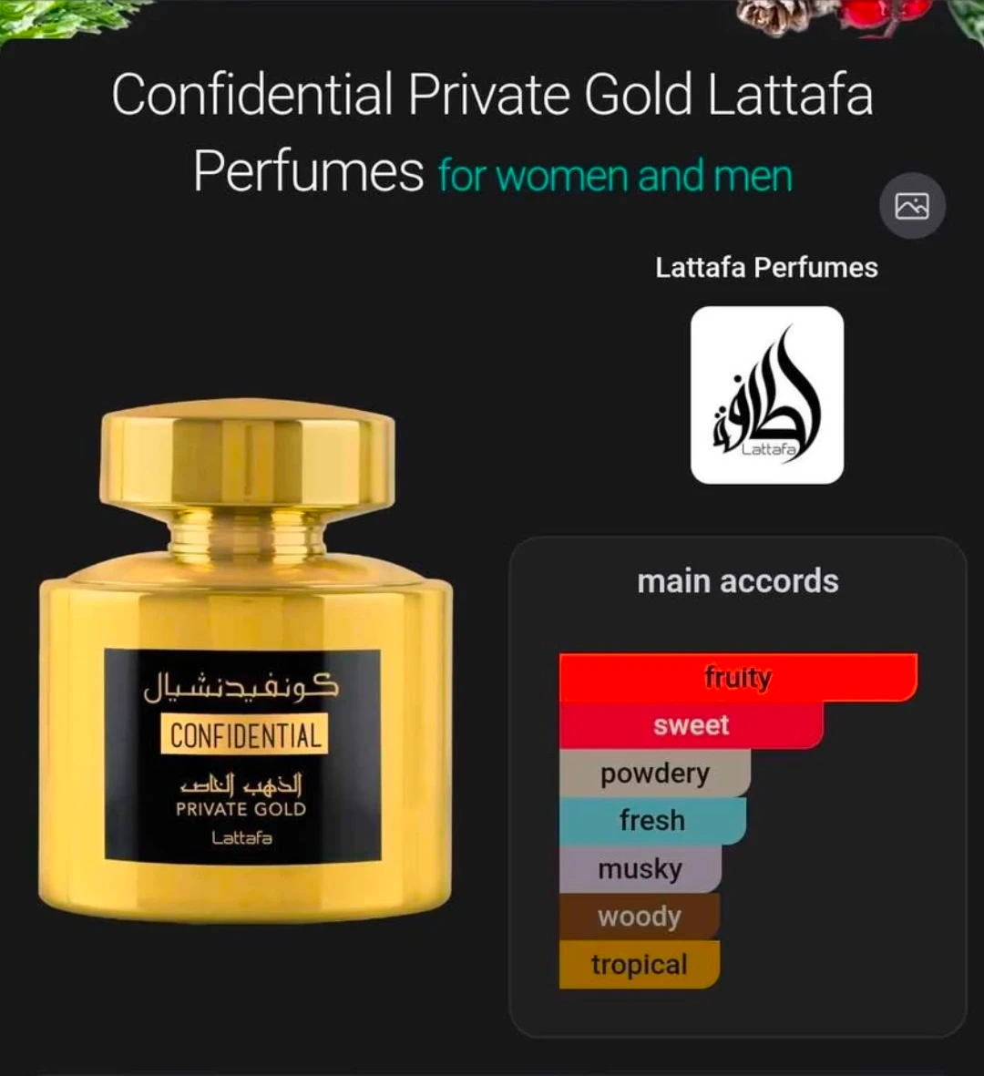 Confidential Private Gold by Lattafa. It's a fragrance for women and men with fruity, sweet, powdery, fresh, musky, woody, and tropical accords. Top notes include peach, passionfruit, pear, raspberry, and cassis. Middle notes feature lily of the valley, with base notes of musk, vanilla, sandalwood, patchouli, and heliotrope.