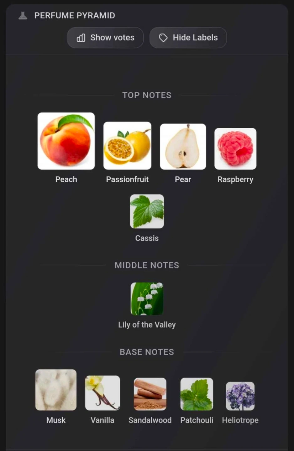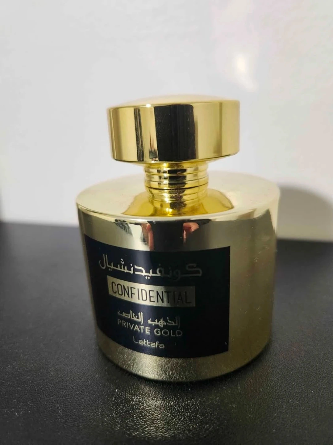 Confidential Private Gold by Lattafa. It's a fragrance for women and men with fruity, sweet, powdery, fresh, musky, woody, and tropical accords. Top notes include peach, passionfruit, pear, raspberry, and cassis. Middle notes feature lily of the valley, with base notes of musk, vanilla, sandalwood, patchouli, and heliotrope.