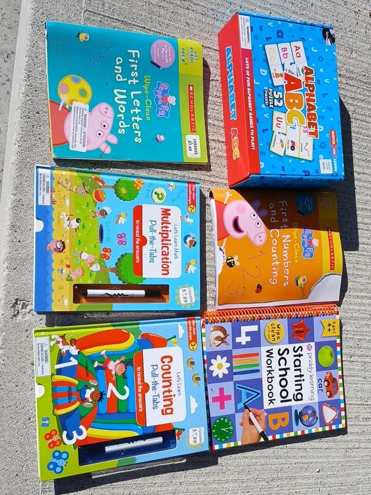 Set includes Peppa Pig Wipe-Clean First Letters and Words, First Numbers and Counting, Multiplication Pull-the-Tabs, and Counting Pull-the-Tabs books. Also includes an Alphabet 52-piece puzzle game. These wipe-clean books come with a marker for repeated learning. Great for preschoolers learning letters and numbers!