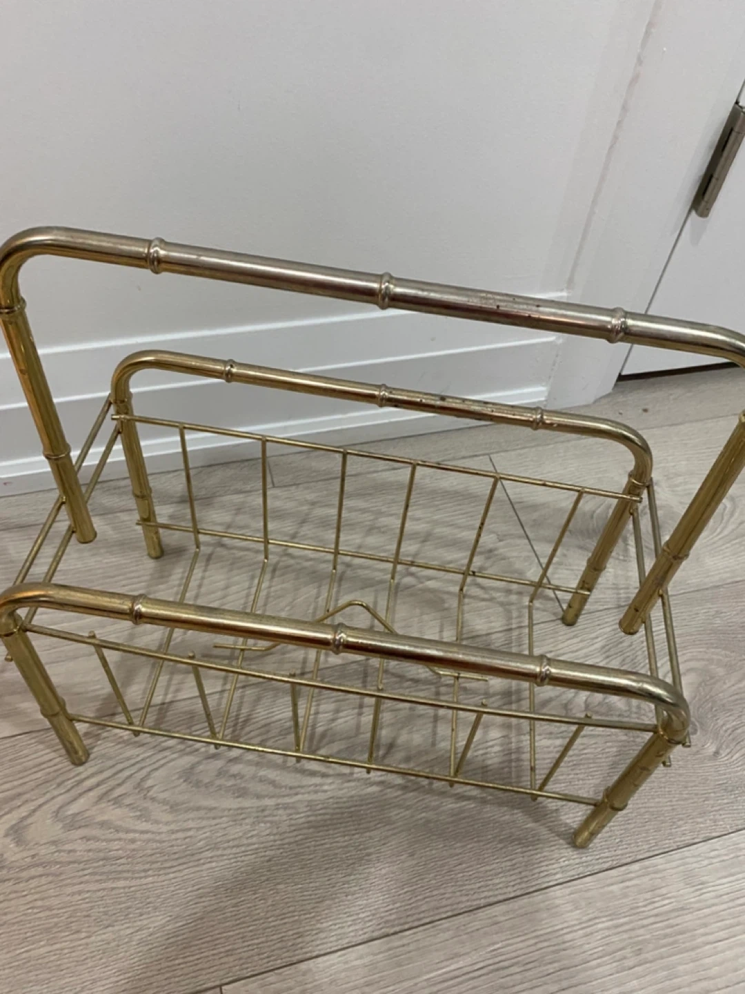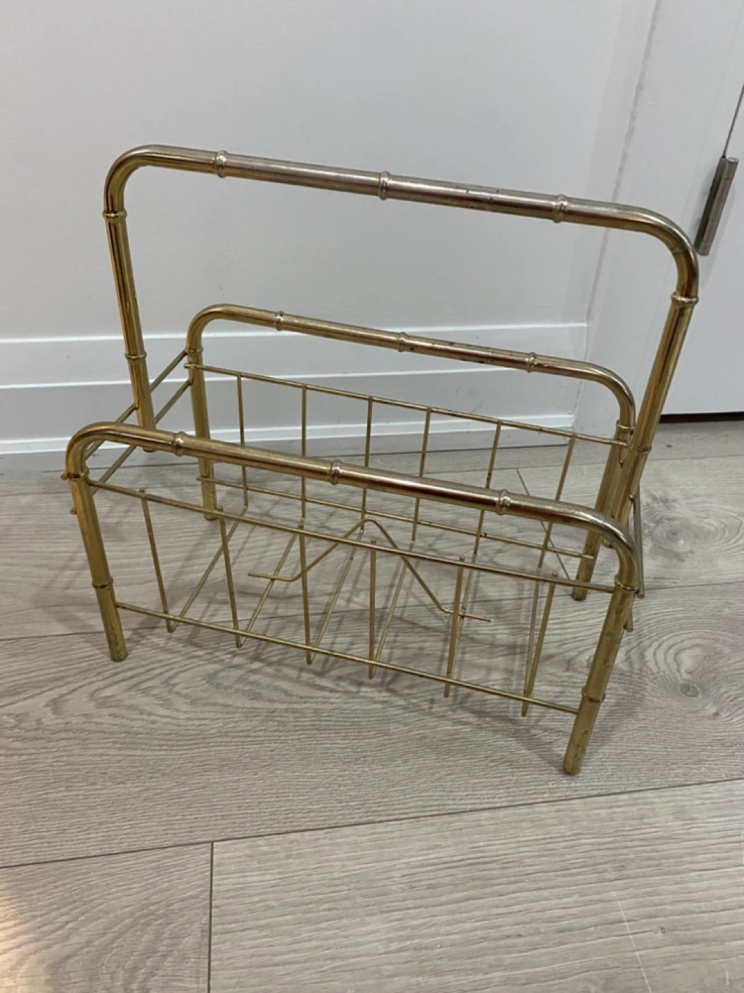 This vintage magazine rack is made of brass with a bamboo-style design. It has two tiers for organizing your reading materials. A nice addition to any living room or den!