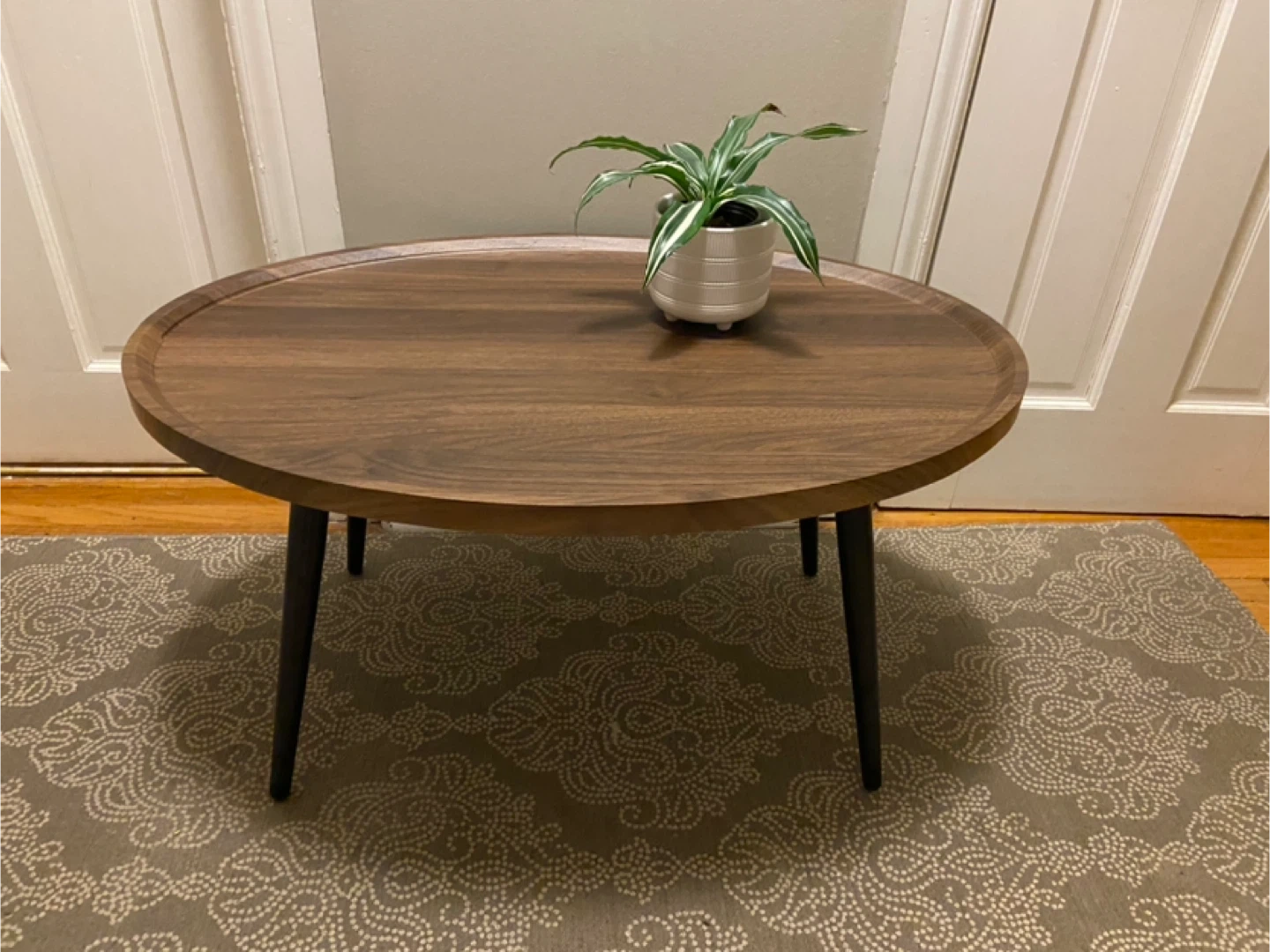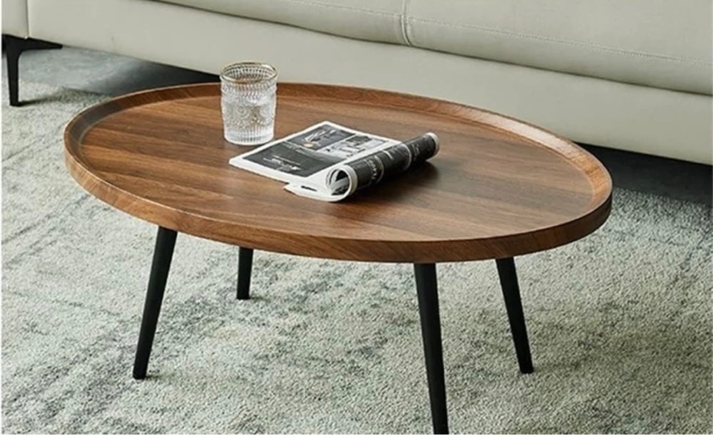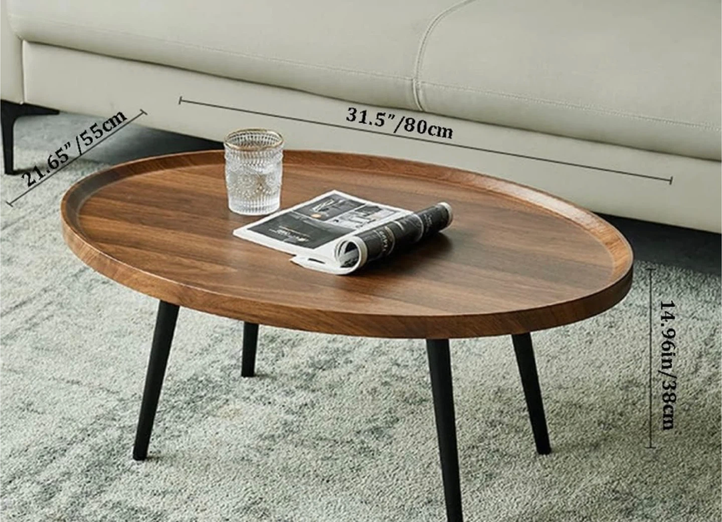 This oval coffee table is made of thick density fiberboard panel with veneer, which is waterproof and anti-scratch. 4 metal legs give the table a high degree of stability