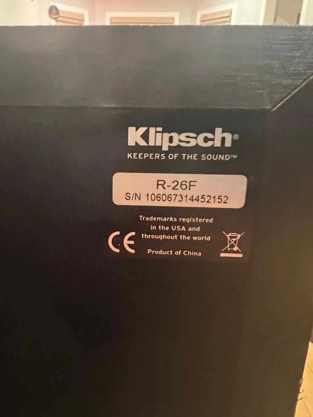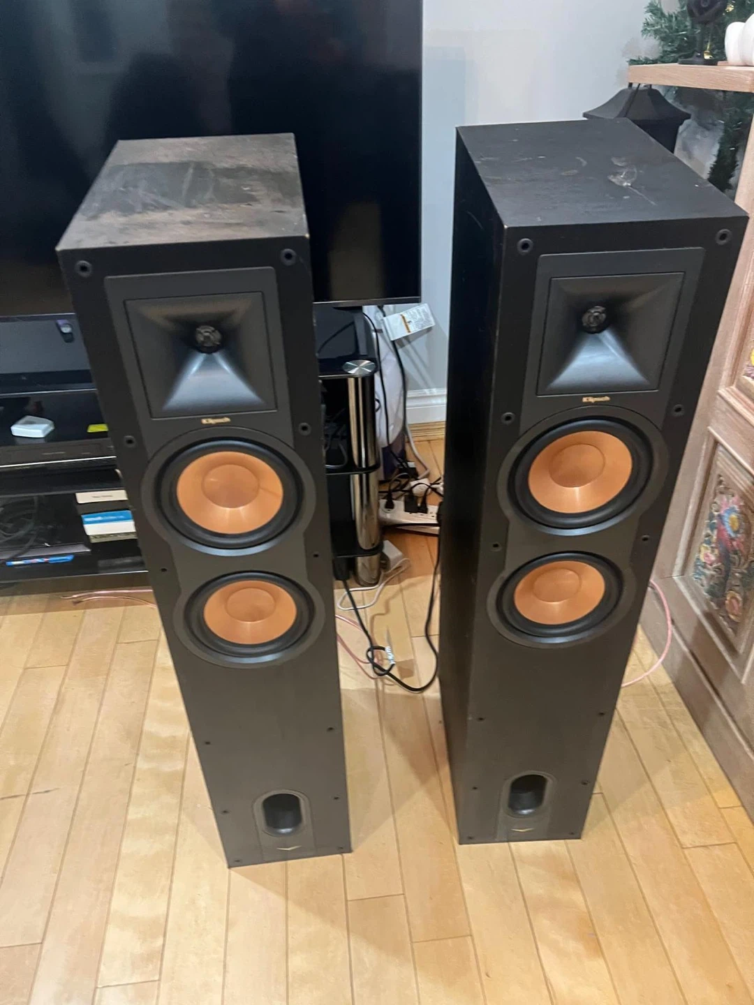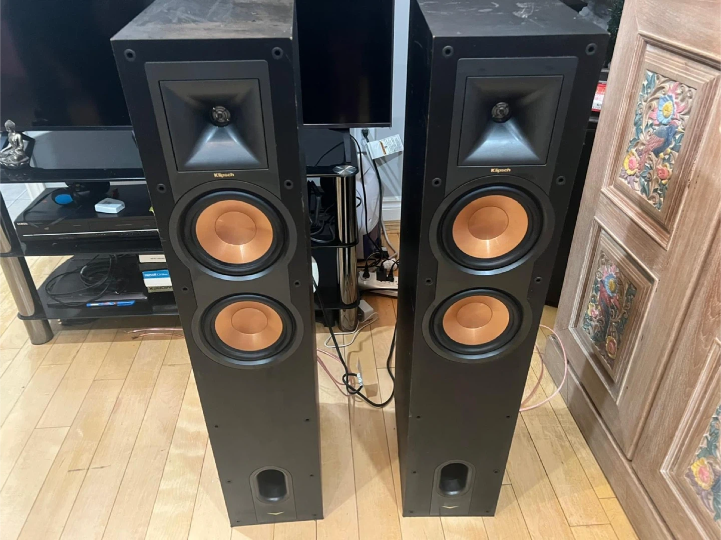 Selling a pair of Klipsch R-26F floorstanding speakers. These black tower speakers feature Klipsch's signature copper woofers and horn-loaded tweeters. They're ready to bring powerful sound to your home entertainment setup!
