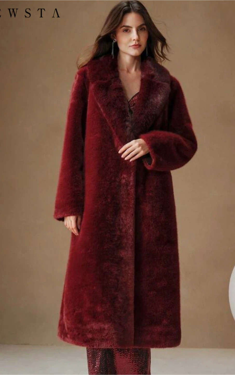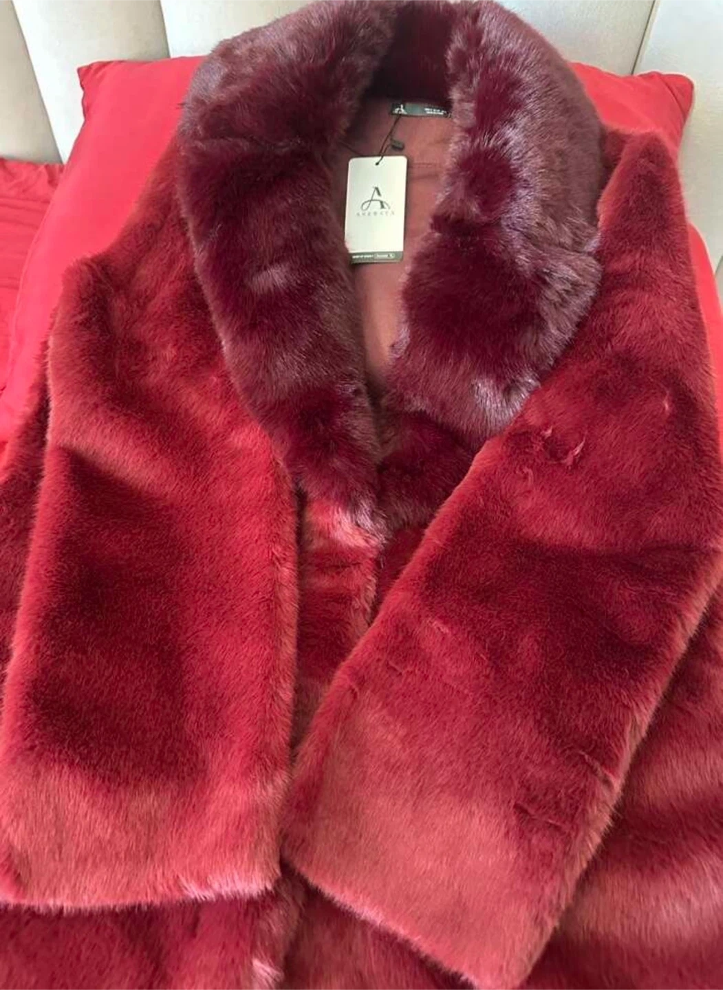 This is a stylish faux fur coat in a deep burgundy colour. It has a soft, luxurious feel and a generous collar. Great for dressing up any outfit!