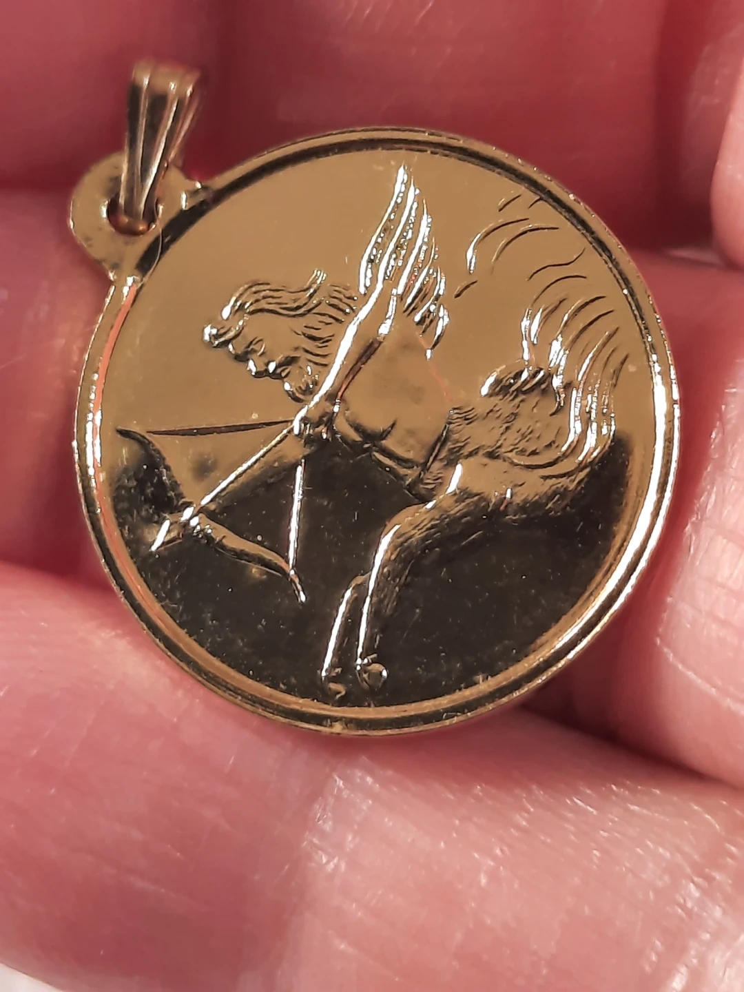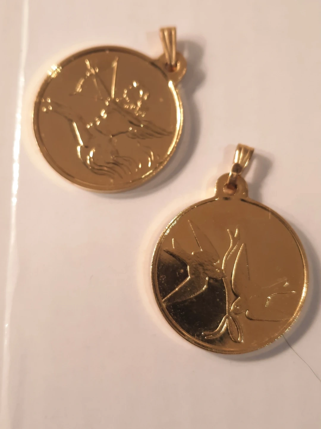 Two gold-tone gold platedmedallions, each featuring a different embossed design. One shows a celestial figure with a bow and arrow, possibly Cupid or Sagittarius. The other has an abstract design with what appears to be an 'M' or chevron pattern and a central circle. It's a nice set for crafting or personal adornment.one has 2 sides design.